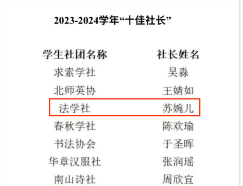 Adhering to the "Beijing Normal University Student Club Construction and Management Regulations," as well as the "Beijing Normal University Student Club Annual Review and Evaluation, and 'Outstanding Student Club' Selection Procedures," the process was governed by the principles of fairness, justice, and transparency. Following a rigorous review of documentation and on-site presentations, two clubs from the Law School, the Beijing Normal University Law Society and the Beijing Normal University Legal Education Volunteer Association, stood out among over 200 clubs. They were respectively awarded the titles of "Outstanding Student Club (First Prize)" and "Outstanding Student Club (Second Prize)" for the 2023-2024 academic year. Additionally, Su Wan'er, the president of the Law Society, was honored with the title of "Top Ten Presidents" for the same period. Notably, the Beijing Normal University Law Society has achieved the "Double Top Ten" recognition for 22 consecutive years.
