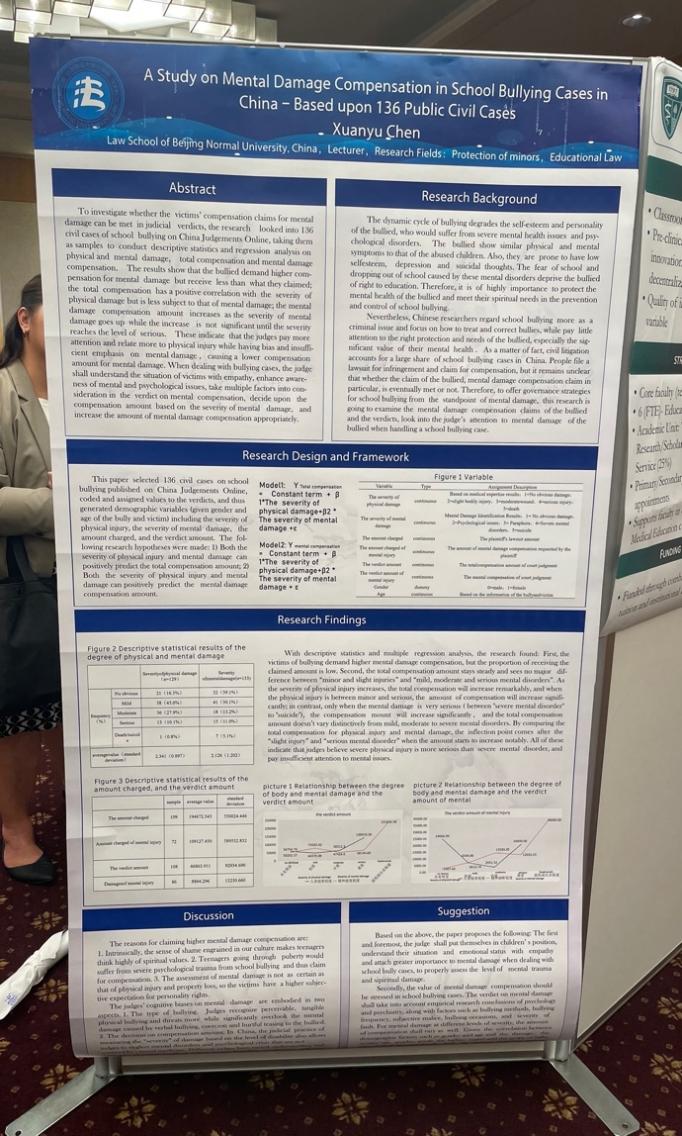 The presentation delivered by Dr. Chen Xuanyu was titled "Exploring Mental Damage Compensation in School Bullying Cases in China." During the poster session, the research captured the attention of numerous scholars. International academics inquired about the study's model selection, reliability, and validity. Dr. Chen addressed each query and the associated concerns with precision and clarity, earning positive feedback for his comprehensive responses.