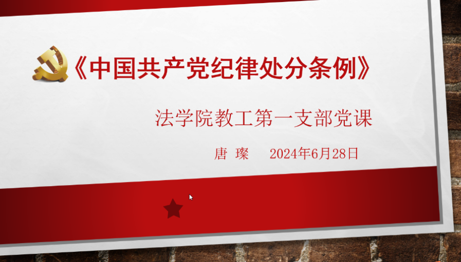 6月28日,日本AV 教工一支部围绕新修订的《中国共产党纪律处分条例》举行支部书记讲党课活动。支部书记唐璨老师围绕《中国共产党纪律处分条例》制定、修改基本情况以及结合专业谈学习体会两方面与支部同志交流对党纪的理解与运用。尤其是在纪律处分工作基本原则、纪律处分运用规则方面,结合法律制度和具体规则讲授分析了党纪处分与政务处分以及其他法律责任的关系等问题。