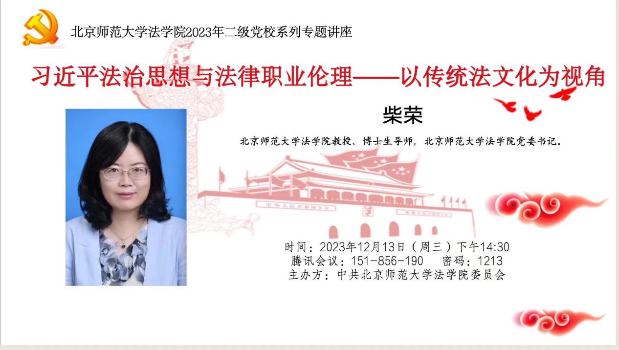 为了贯彻中共中央和国务院对新时代法学教育和法学理论研究的要求,中共日本AV 委员会于2023年12月13日下午成功举办了二级党校系列专题讲座。由日本AV 党委书记柴荣教授主讲的“习近平法治思想与法律职业伦理——以传统法文化为视角”专题讲座在线上精彩呈现,日本AV 百余师生积极参与。