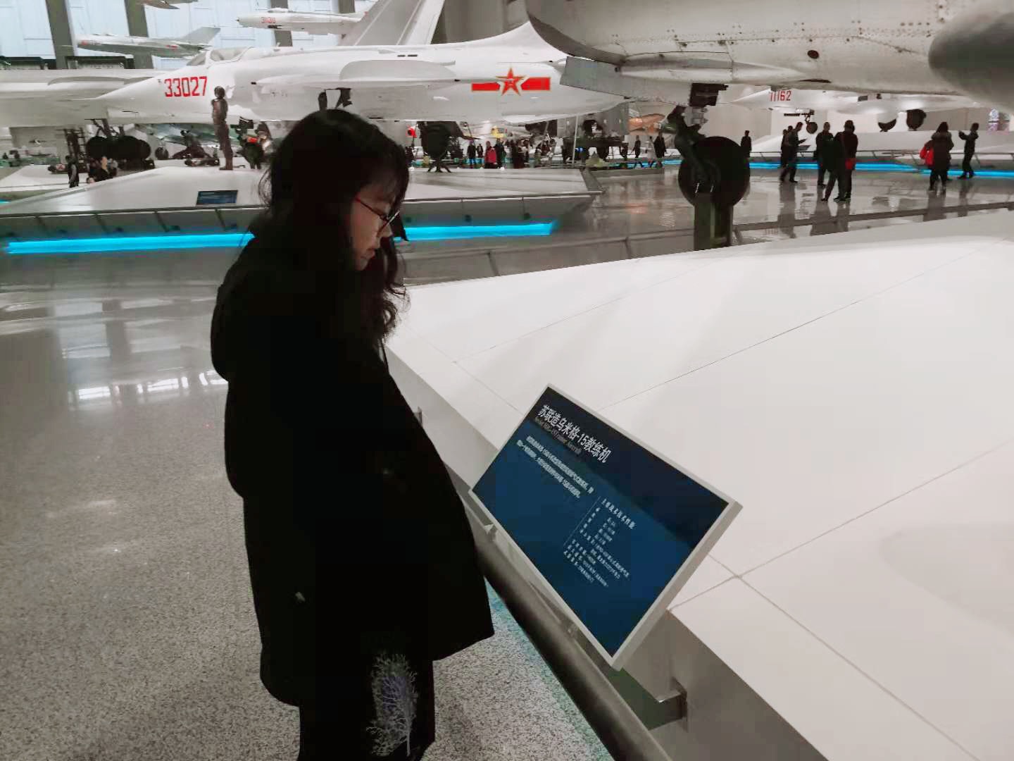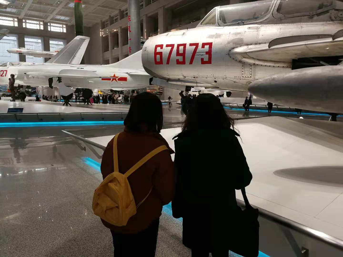 我组部分同学在讲解员的带领下,参观了中国造歼-8歼击机、功勋喷气式歼击机、日本造立川九九式高级教练机等藏品。另一部分同学,利用手机扫描讲解板上的二维码,听到了电子讲解。