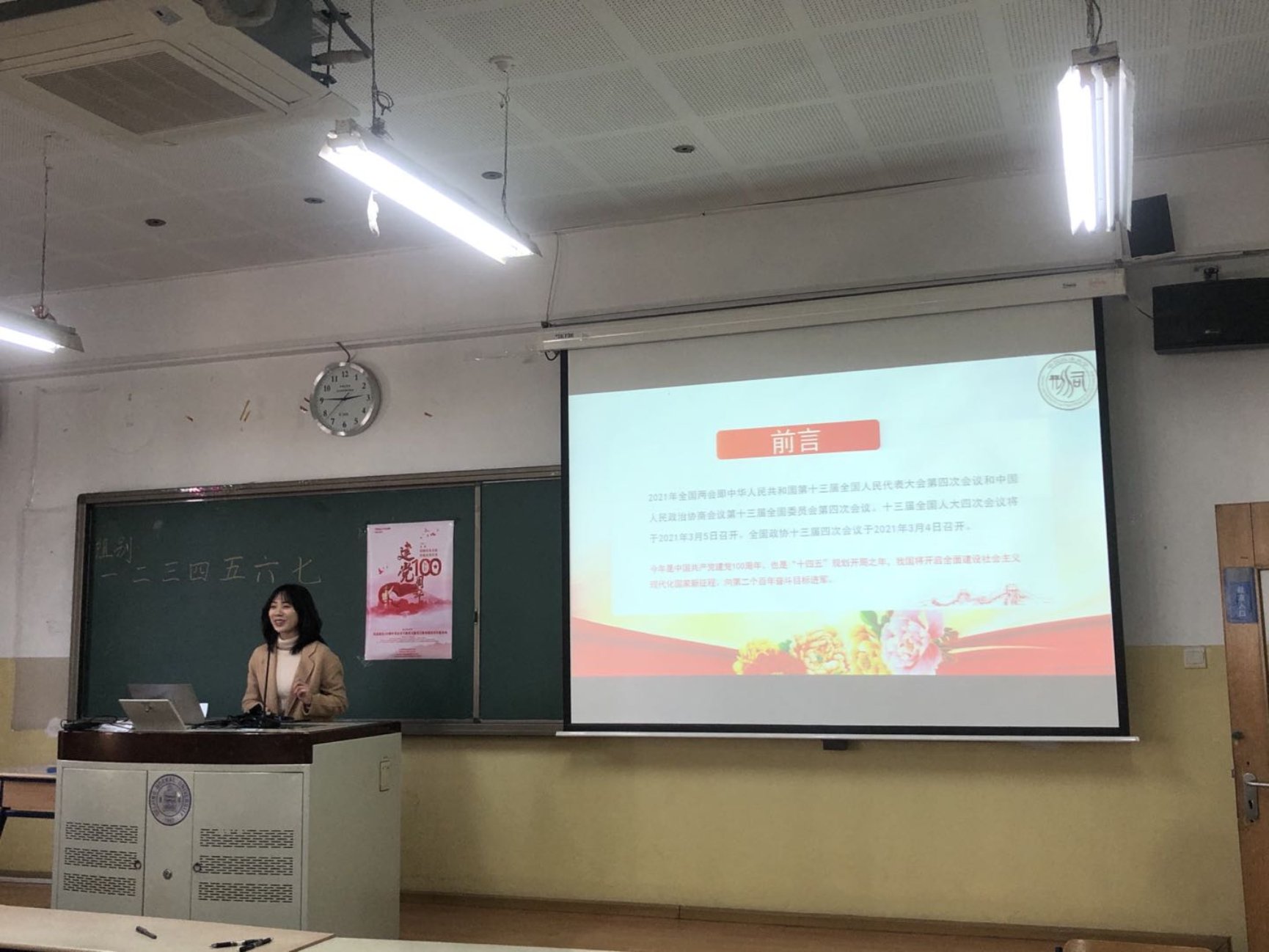 在两会精神解读的分享中,韦婉同志首先通过新华社记者张扬的两会vlog让我们直观的感受了一番别样的两会;其次,该同志根据2021年两会在疫情、农业、民生、法治等方面的内容总结出了七大看点,让同志们能更具体的了解到本次两会的具体内容;最后,该同志以发展为核心,对两会期间就“十四五”的发展在计划、内涵与落实三方面进行了详细的解读,让同志们真正了解到我们这代人的主题就是紧跟党的步伐,努力实现中国梦,奋进开启新征程。韦婉同志表示:“作为新时代的追梦人,我们应当在党的带领下,以奋斗者的激情,爱岗敬业,努力践行‘变、干、实’,成为时代的见证者和最美奋斗者,为实现“十四五”目标贡献智慧和力量,为实现伟大复兴中国梦砥砺奋进。”