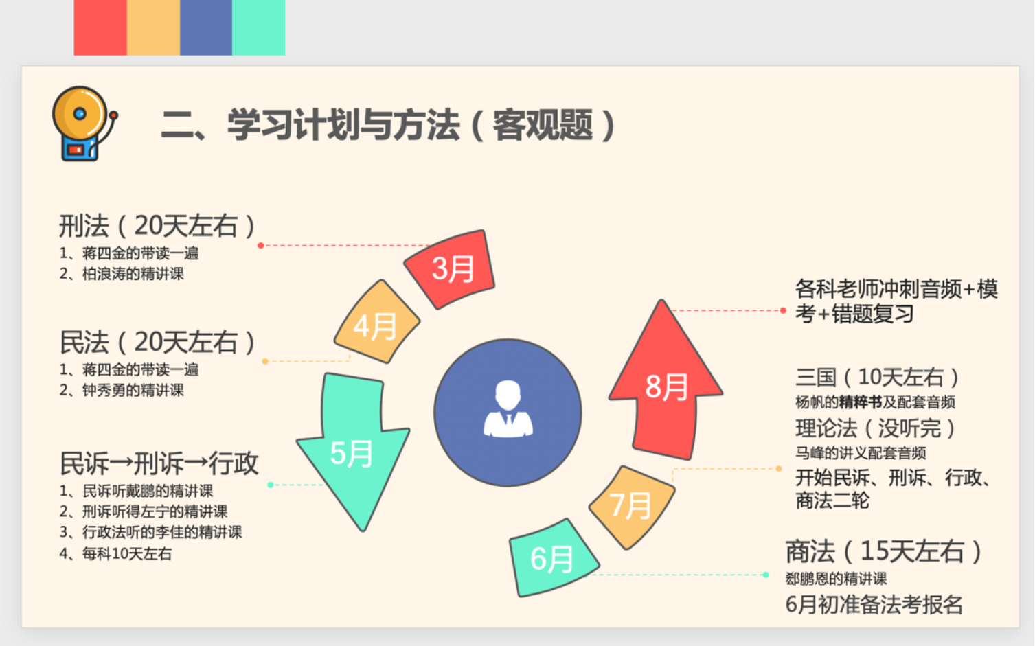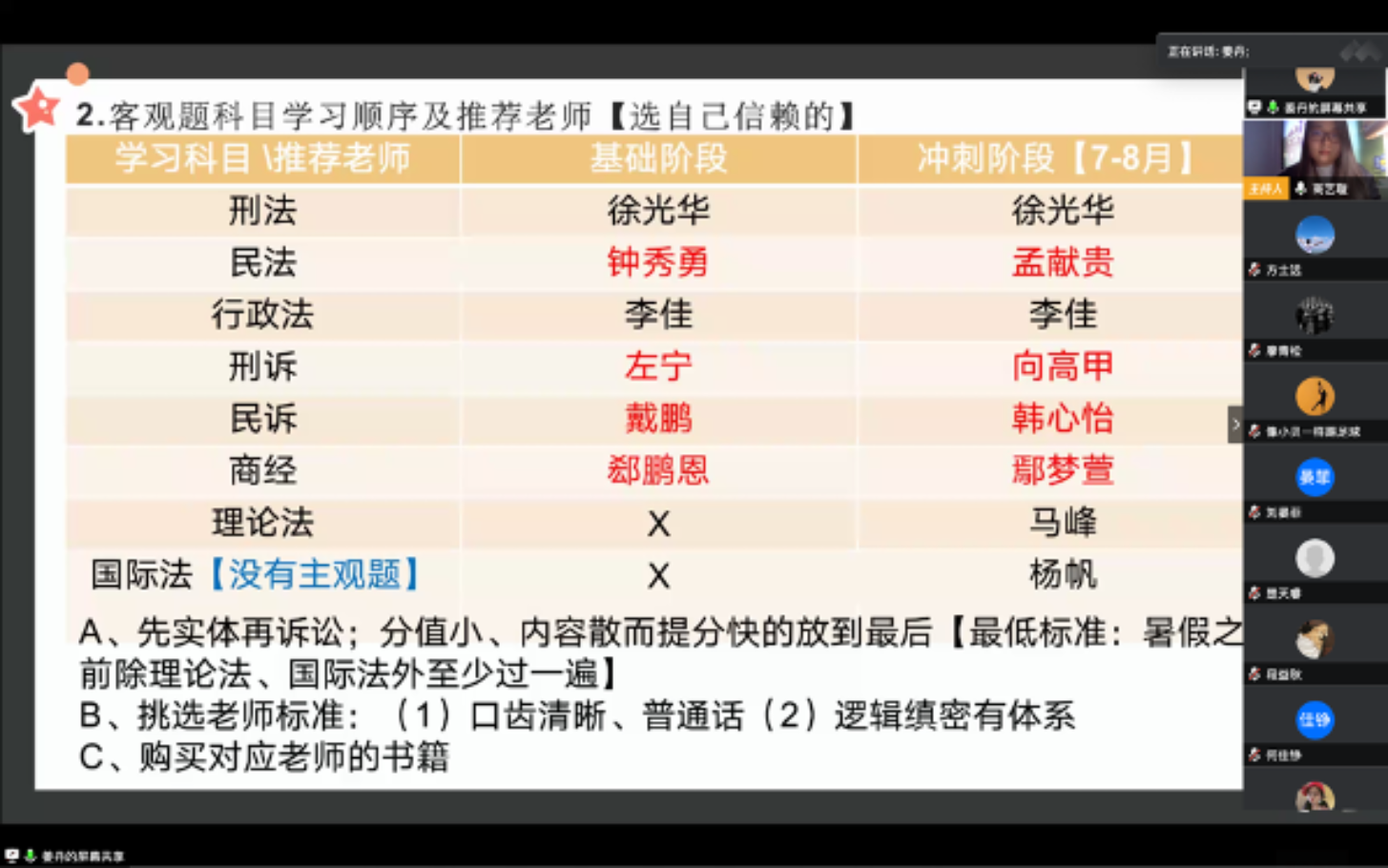 首先进行分享是姜丹同学,她分别从考试特点、客观题科目学习顺序及推荐老师、主客关系、学习方法和心态五个方面展开。针对法考考试的特点,她在备考过程中主要采取的是先实体再诉讼的顺序,建议大家挑选老师时选择自己信赖的老师,可以进行试听,确定了以后就不要再改变。她也建议大家可以多多参与模考,科学合理地安排背书时间和备考计划。在主观题备考方面,她建议除了各个机构辅导书外还要购买司法部官方的《案例分析指导用书》,不要放弃任何科目,用时间投入换回信心,只要按部就班就会有成果。