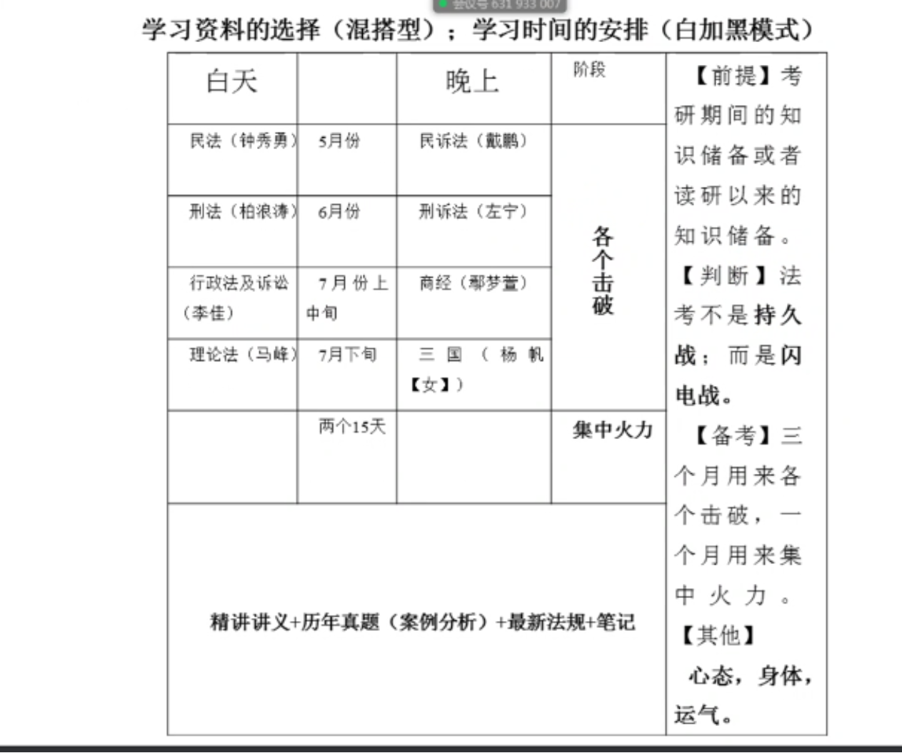 之后进行分享的是邓军林同学,他从抽象的目标到具体的行动规划出发,结合自己的备考经历分享了他的复习经验。通过对知识学习“了解-熟悉-理解-运用-掌握”这一抽象层面的规律性,他结合自己实际情况制定了“讲义-视频-讲义-真题-笔记“的具体复习规划。在学习资料的选择方面他采取的是混搭型,选取了各个机构适合自己的老师,在学习时间的安排方面,他采取的是“白加黑模式”,他认为法考本质是水平考试,不是持久战而是闪电战,大家通过考研期间或者读研以来的知识储备已经可以应对这场考试,希望大家保持好心态和身体,对自己充满信心。