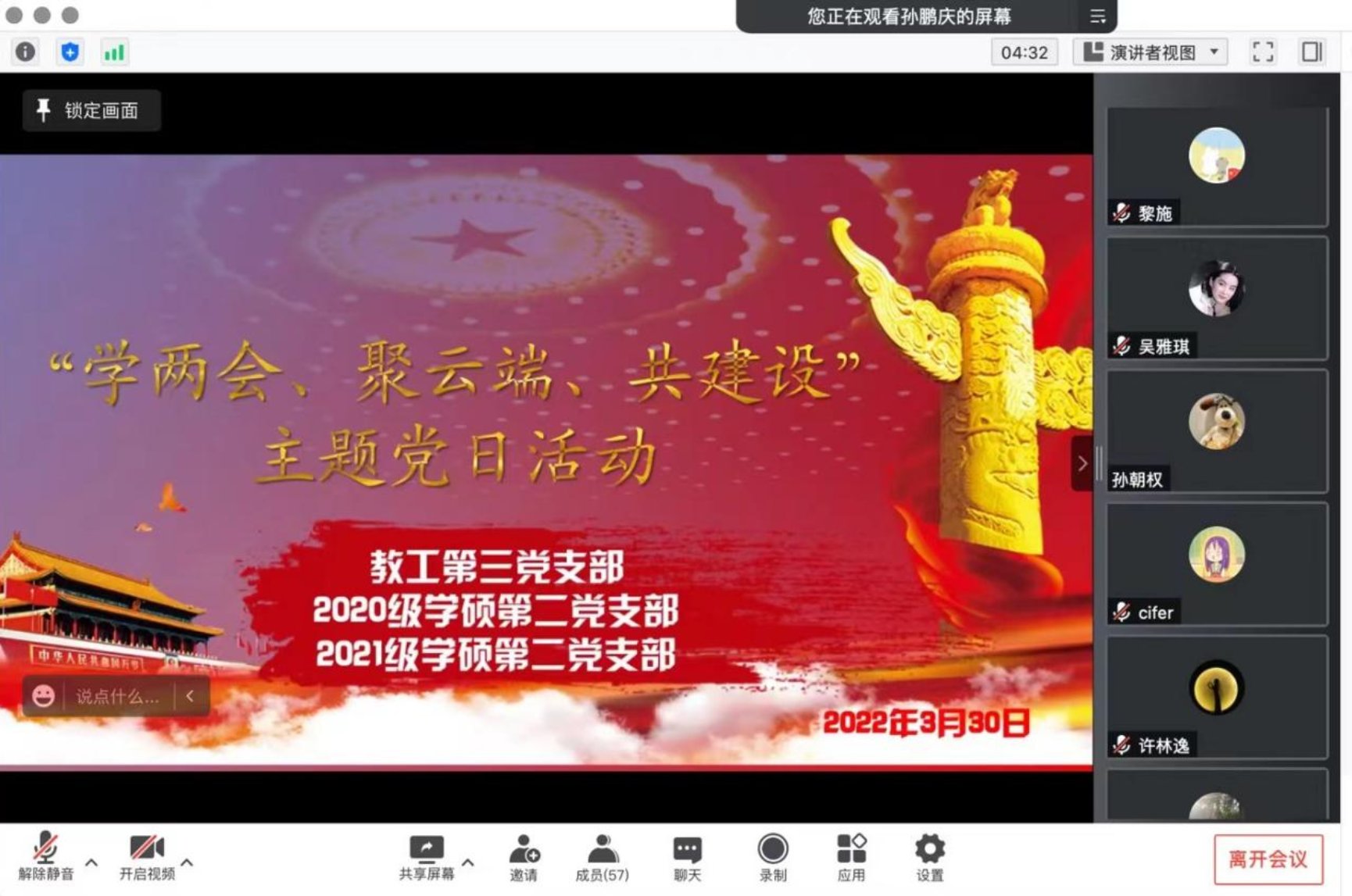 2022年3月4日-11日,中华人民共和国第十三届全国人民代表大会第五次会议和中国人民政治协商会议第十三届全国委员会第五次会议在北京举行。为深入学习贯彻两会精神,在聆听时代强音的同时,催发同志们日益奋进的动力,2022年3月30日晚19:30,日本AV 2021级学硕第二党支部、2020级学硕第二党支部、日本AV 教工第三党支部以“学两会、聚云端、共建设”为主题开展党建共建活动。本次会议由日本AV 2021级学硕第二党支部书记孙鹏庆同志主持,三个支部党员、预备党员、入党积极分子共计近70人参与本次活动。
