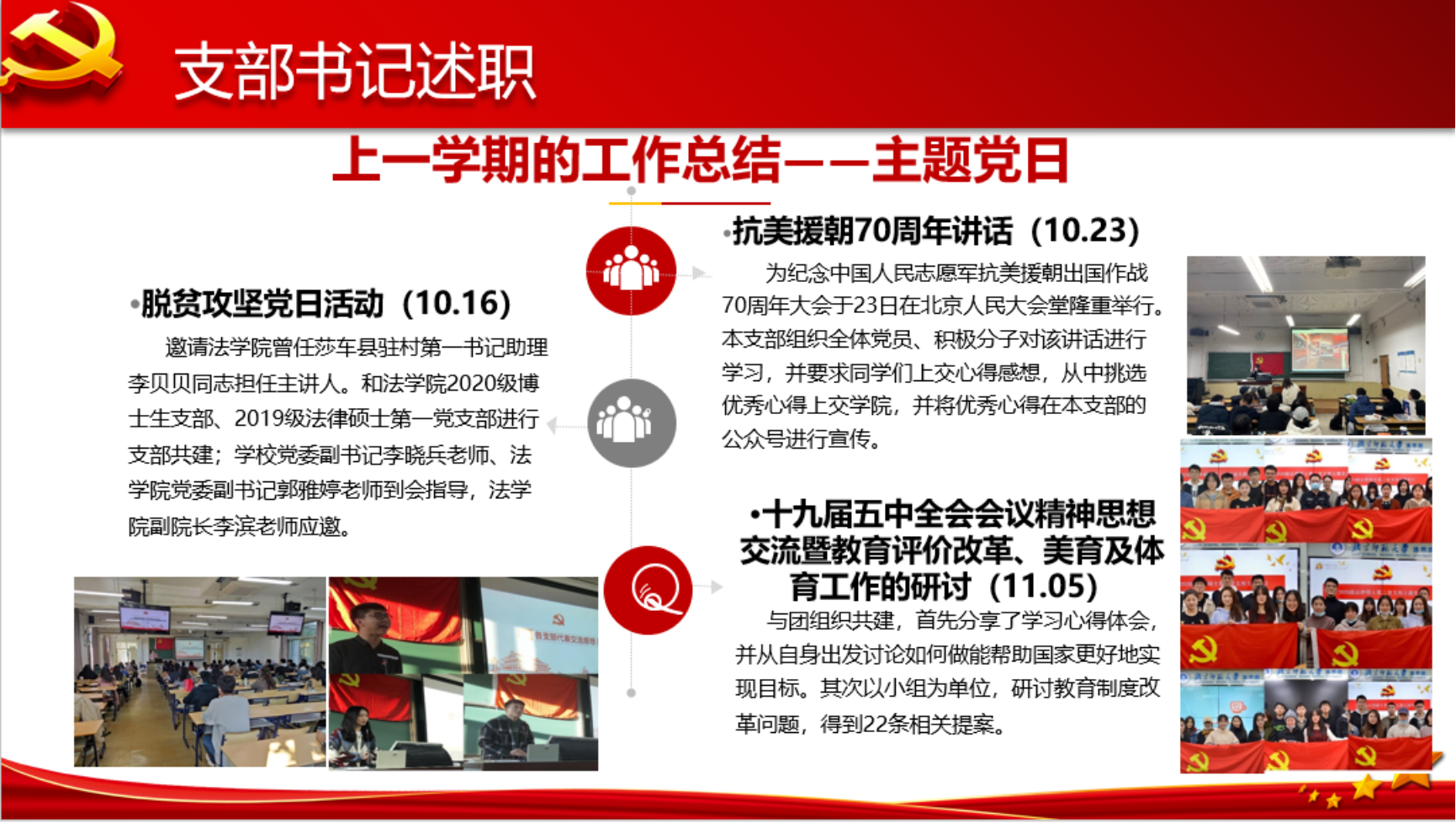 会议第三项,党支部书记邢子烟同志首先根据本学期的工作进行述职报告,向支部成员介绍了本支部的基本架构、管理情况、三会一课及主题党日等的开展情况,并对支委会内部的成员具体分工情况进行公示。