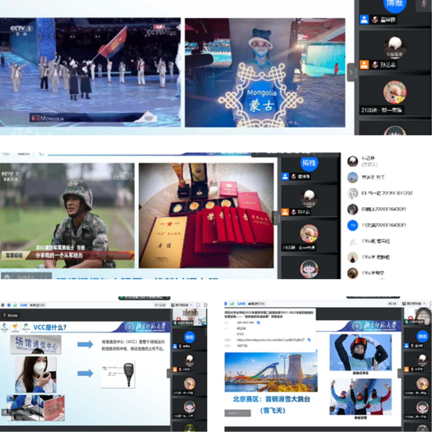 本次活动特别邀请到北师大冬奥青春宣讲团成员陈卓、于艺铭、张思原、石佳四位成员。陈卓同学以《中国红、冰雪白与师大蓝的美好遇见》展开,再次带我们重温了冬残奥会的精彩瞬间,于艺铭、张思原、石佳三位同学则分别从自己作为冬奥会开幕式蒙古代表团引导员、国家速滑馆VCC业务领域志愿者以及国家体育馆反兴奋剂业务领域志愿者的亲身经历出发,带我们了解了这场盛会台前幕后的青春故事。每一个引导员、志愿者都是一片“燃烧的雪花”,守护冬奥会的顺利开展,以坚强的政治定力、饱满的热情活力、扎实的服务能力,圆满完成了各项服务保障任务。
