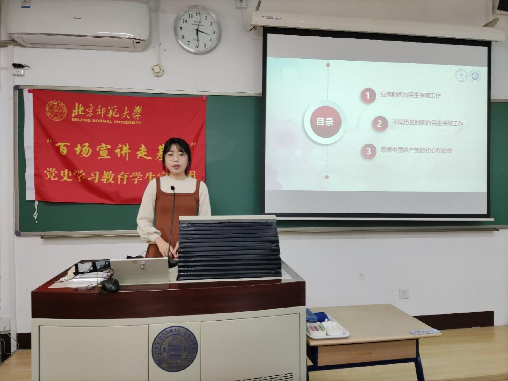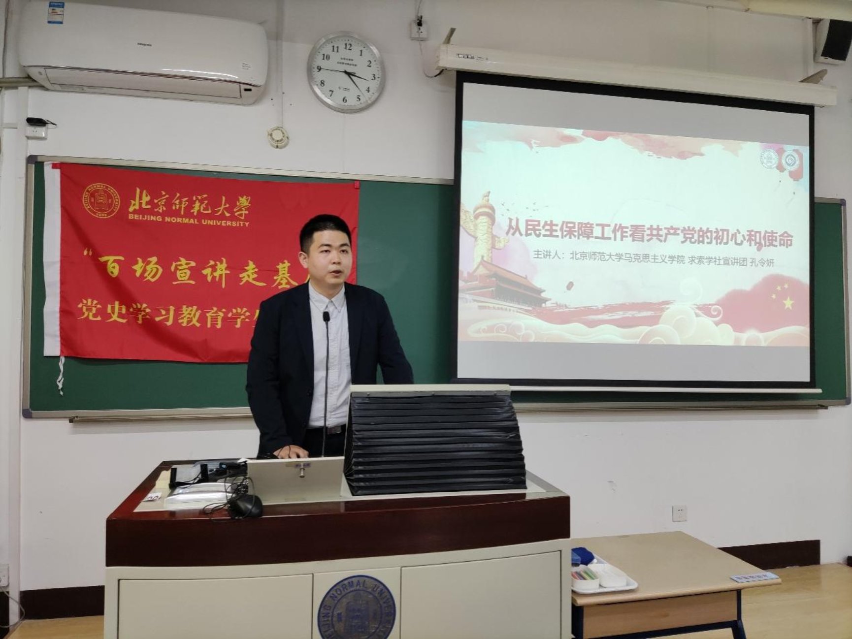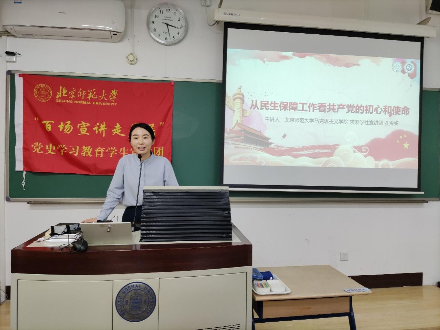 然后,来自日本AV 马克思主义学院、求索学社宣讲团的孔令妍同志进行了以《从民生保障工作看共产党的初心和使命》为题为大家进行了主题宣讲。孔同志从疫情期间的民生保障工作、不同历史时期的民生保障工作和感悟中国共产党的初心和使命三个角度完成宣讲,让在场的各位同志更深刻地认识到我们党是一以贯之坚持初心的党,党的一切工作都是从人民利益出发,从人民利益着想,我们作为青年党员要认识到自己的使命,要敢于担当,善于担当。