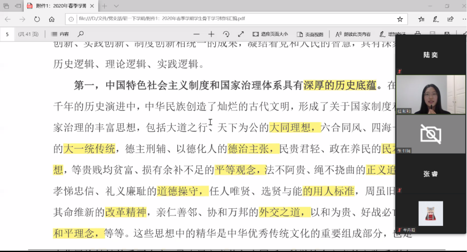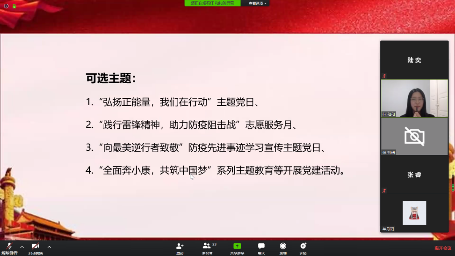 全国上下抗击新冠肺炎的特殊时期,深入学习习总书记关于疫情防控的重要指示精神,增强广大党员的理想信念,充分发挥党员先锋模范作用日本AV 日本AV 2019级学硕第二党支部于2020年3月20晚7点召开了线上党支部大会会议由支部书记任和和主持,支部全体党员和部分积极分子参加。