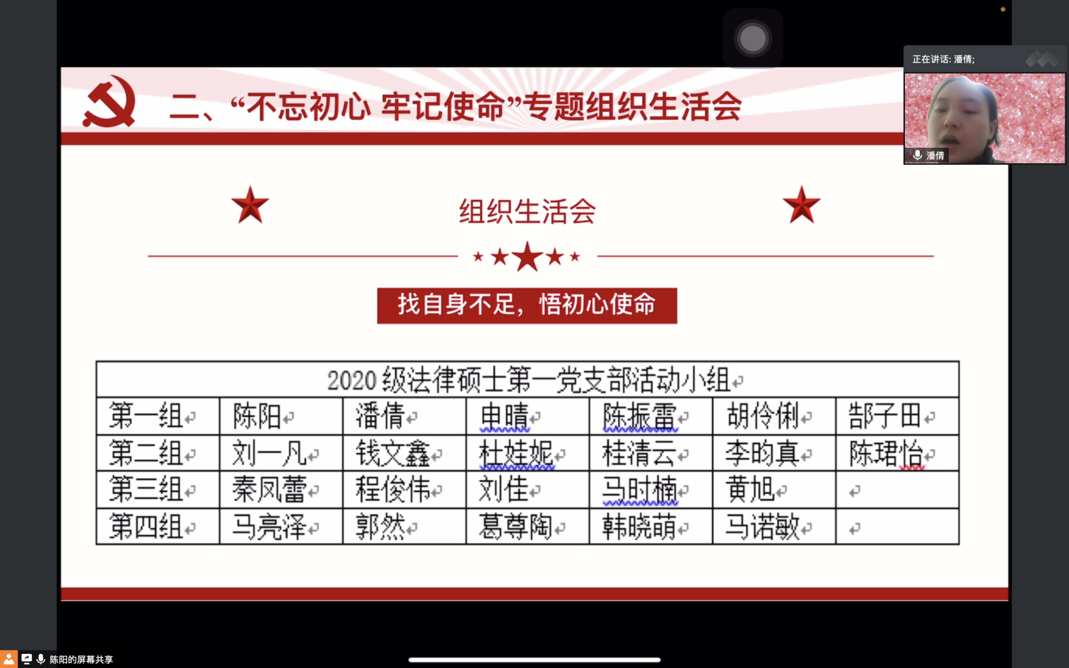 2021年3月3日,日本AV 2020级法硕第一党支部通过腾讯会议组织开展了支部全体党员大会暨“不忘初心,牢记使命”专题组织生活会,本次会议共有22名正式党员参加,会议由党支部书记陈阳主持,日本AV 党委副书记郭雅婷老师莅临本次会议。
