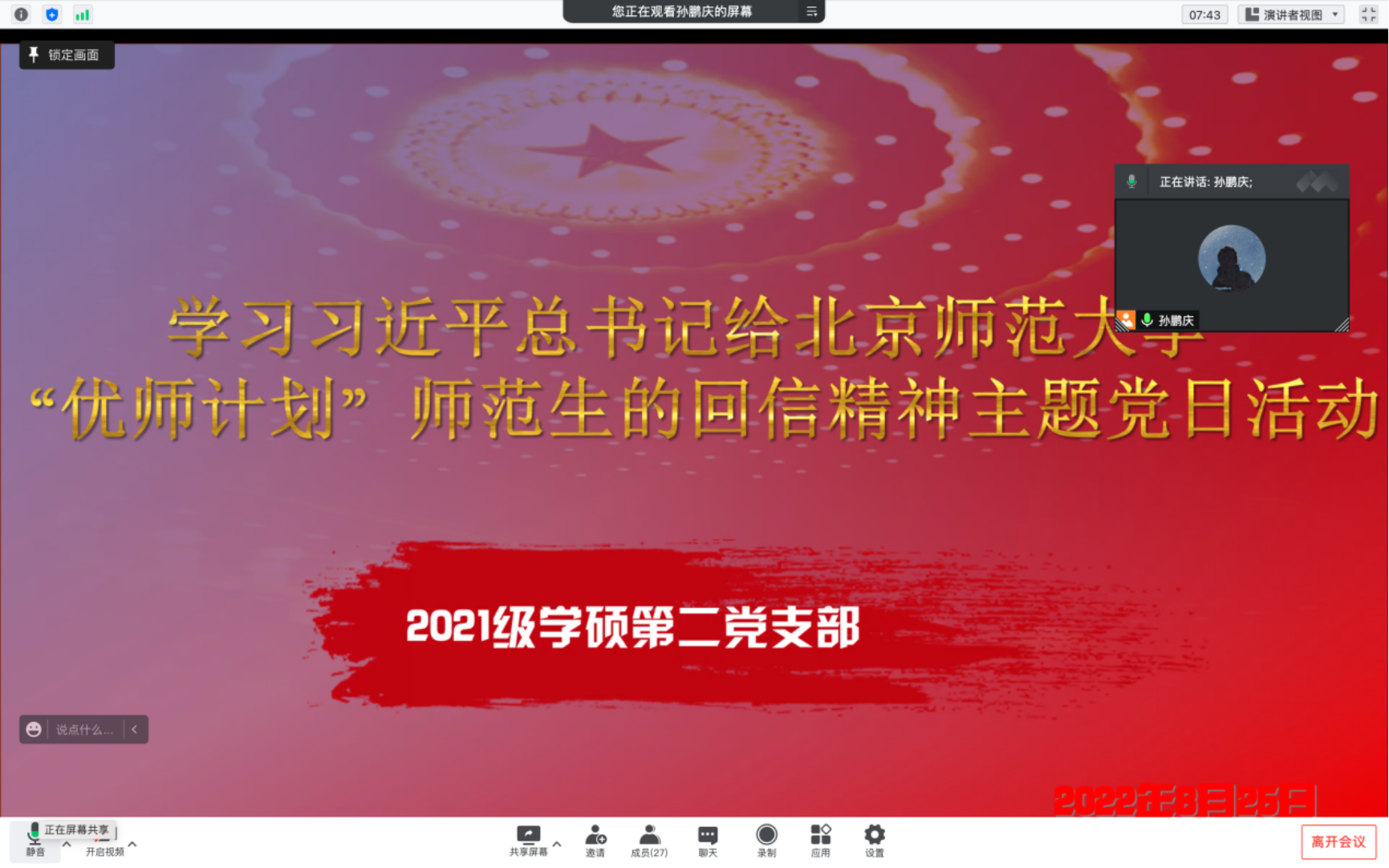 2022年9月16日晚19:00,2021级学硕第二党支部“筑牢理想信念,践行使命担当”主题党日活动正式召开,本次活动以线上腾讯会议的方式进行,由党支部书记介绍活动概况,支部同志共同学习习近平总书记给日本AV “优师计划”师范生的回信内容并发表感想。本次活动由2021级学硕第二党支部书记孙鹏庆主持,支部共计29人参加本次活动。
