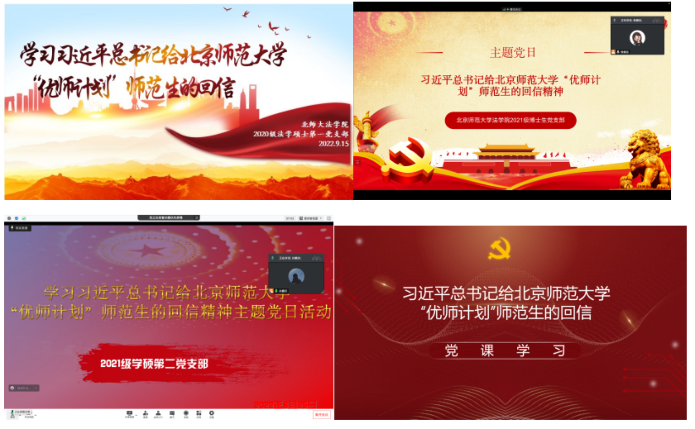 各学生支部以主题党日、主题研讨、支部书记领读等形式认真学习回信,实际的感受到总书记对于“优师计划”和教师事业的鼓励和期盼,对于新时代教育为党育人、为国育才,培育四有好老师的殷切期望。作为法律专业学生,我们也应增强理论和专业知识,为社会主义法治建设贡献力量。