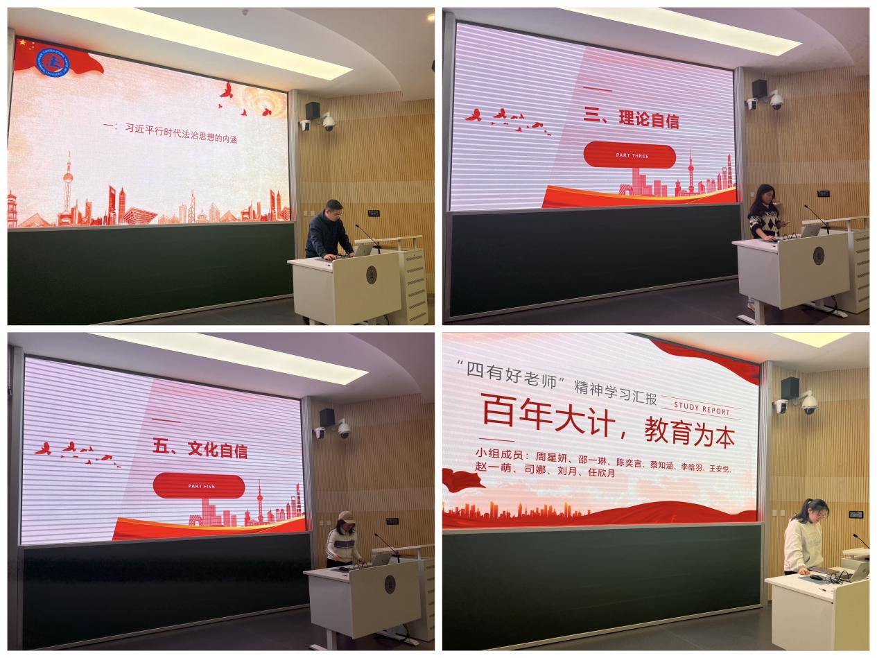 第七组张昕毅同学分享了通过学习和探讨党对全面依法治国的领导这一思想要义,小组成员体会党在全面依法治国进程中的领导核心作用,并深入讨论了这一思想在大学生学习生活中如何落实,青年们深刻认识到个人的命运与国家、社会的命运紧密相连,坚持中国共产党的领导,能够更有组织、更有力量地为社会做出贡献,在实现全面依法治国的征程中发挥个人作用,创造无愧于时代、无愧于人民的业绩。第十一组陶钰涵同学的展示围绕习近平法治思想的提出背景,对习近平法治思想的基本思想、核心特征及其核心要义等关键内容,进行了详尽的解读与阐述,带领大家深入学习了中华人民共和国宪法在中国式现代化进程中的重要作用,深刻学习理解了习近平法治思想中的“三新”、“三基”、“六论”等理论范式,以及三个“核心要义”、五个必须长期坚持的“基本原则”,引导大家从理论走进实践。