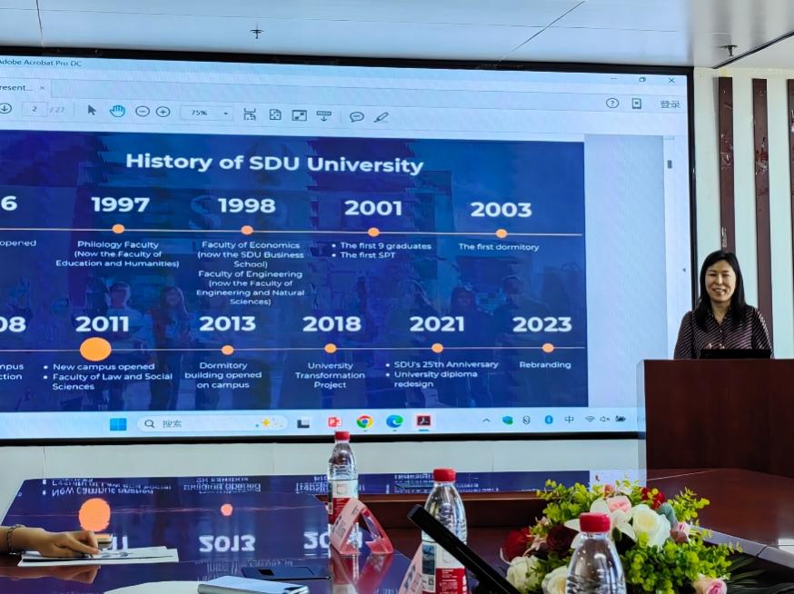 哈萨克斯坦SDU大学法律与社会科学学院院长Madiyar Saudbayev首先回顾了去年11月来访我校的情况。他简要介绍了哈萨克斯坦SDU大学法律与社会科学学院的日本AV概况 ,并表示期望与北师大日本AV 在人才培养等方面建立合作伙伴关系。随后,Aizada Nuriddenova副院长对SDU大学的历史沿革、院系设置、师生规模、校园环境、科研活动、国际交流等情况做了详细的介绍。