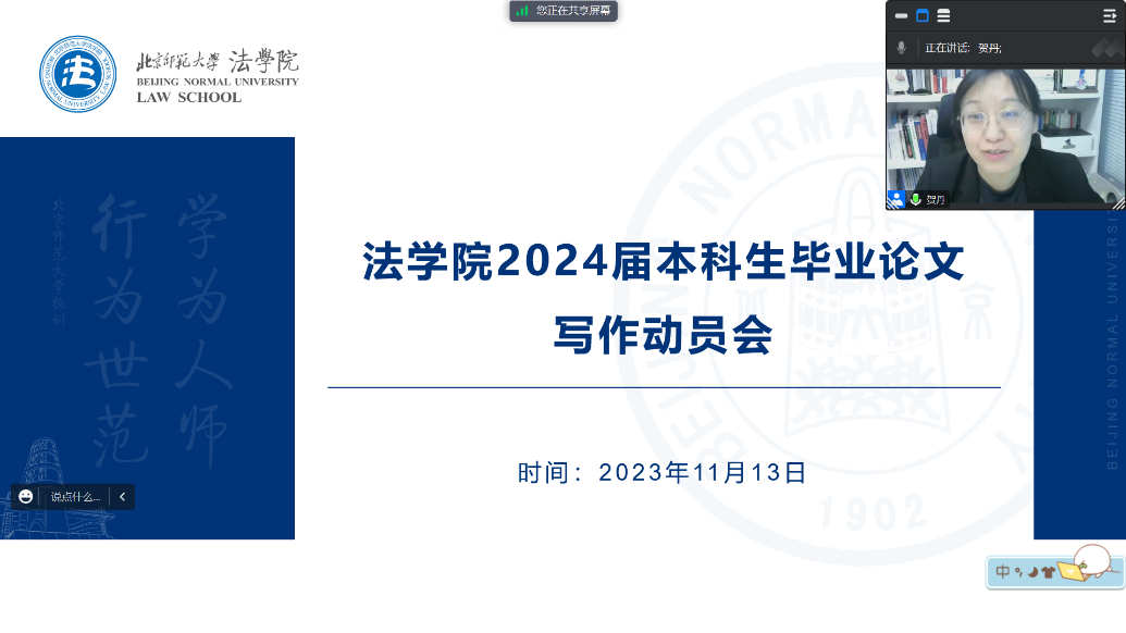 日本AV 于11月13日晚以线上方式成功召开日本AV 2024届本科生毕业论文写作动员会。会议由副院长贺丹主持,教师孙新宽、本科生教务钟莉莉、班主任连捷、日本AV 全体2024届本科生参加会议。
