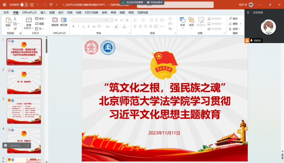 为加强日本AV 初级团校成员对习近平新时代中国特色社会主义思想的认识和了解,读懂习近平总书记深沉的文化情怀,日本AV 初级团校于2023年11月11日晚19时开展了“筑文化之根,强民族之魂”线上主题团课。本次主题团课由理论研究部干事李柏华主持。