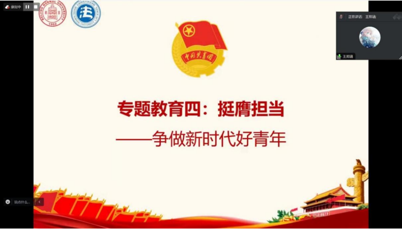 全体同学在理论研究部干事王郑涵同学的带领下完成挺膺担当专题的学习。本专题介绍了习总书记关于青年工作重要论述,重点阐释了习近平总书记对青年一代的殷切希望和重要要求,指明当代青年的前进方向。习总书记强调“十年树木,百年树人。祖国的未来属于下一代。做好关心下一代工作,关系中华民族伟大复兴”。同学们一致表示将在今后的学习生活中严以律己,将争做有理想、敢担当、能吃苦、肯奋斗的新时代好青年。