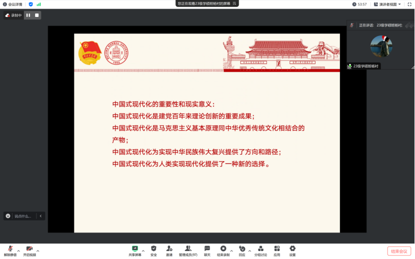强国复兴专题在理论研究部干事杨衬的带领下徐徐引入。本专题从十二个战略部署及相关重要论述、新时代党和国家事业发展的目标任务和中国式现代化这三个角度切入。与会团员认真学习、深刻领会,认识到中国式现代化是强国建设、民族复兴的唯一正确道路。