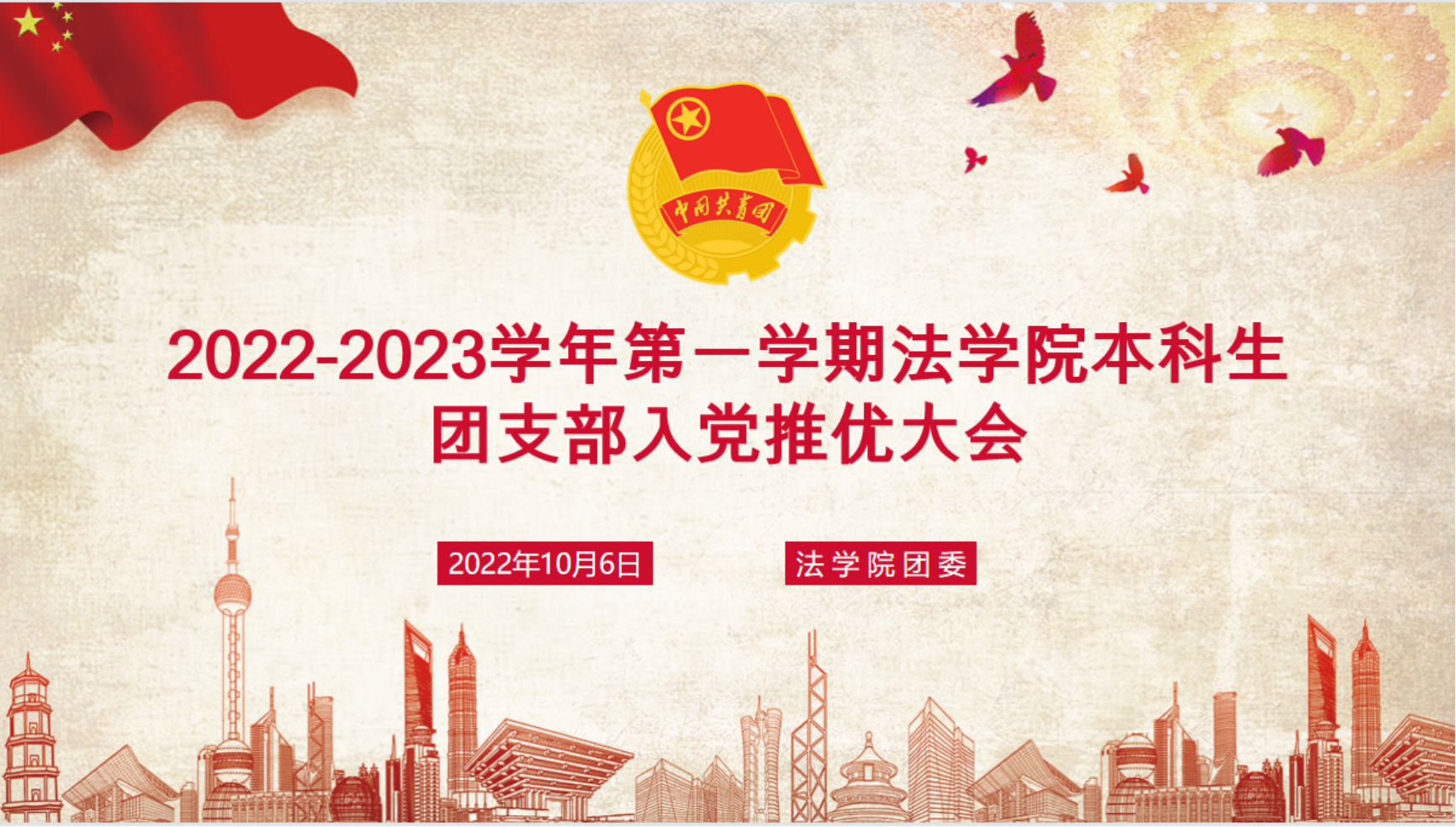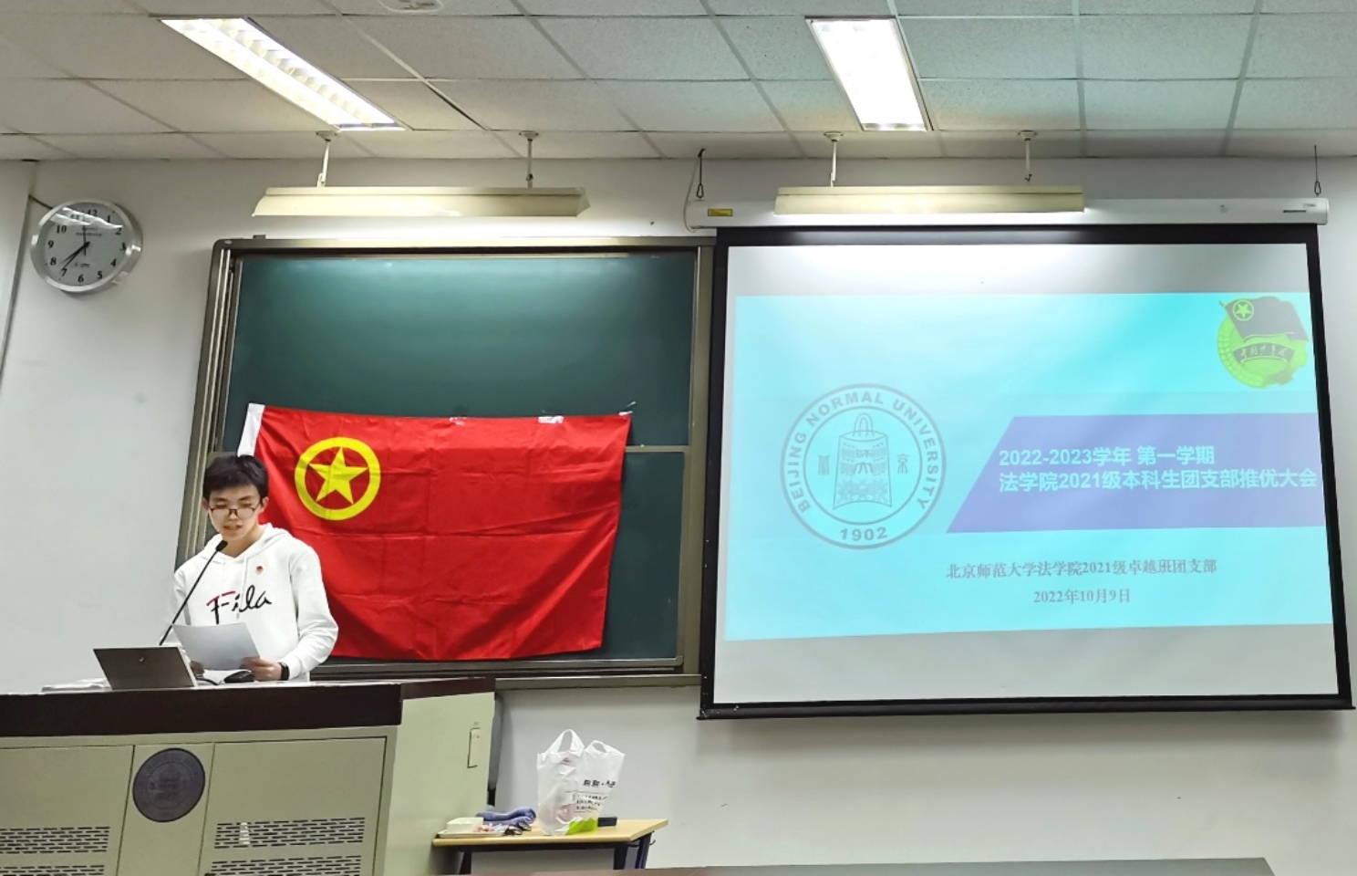 2022年10月7日晚18时,2022级本科一班团支部入党推优大会于后主楼1922教室成功举行。会议由2022级本科一班团支部临时团支书谢慧文主持,日本AV 本科生第一党支部书记李雨修以及日本AV 团委组织部委员李雨轩作为监票组成员出席了本次会议。