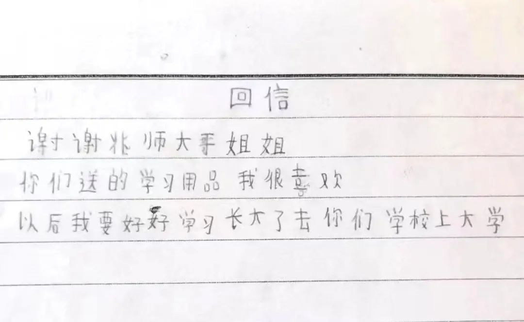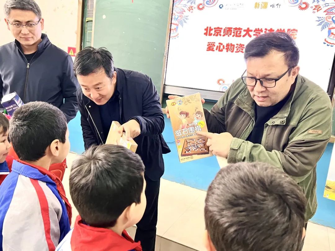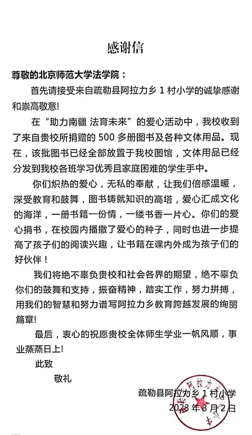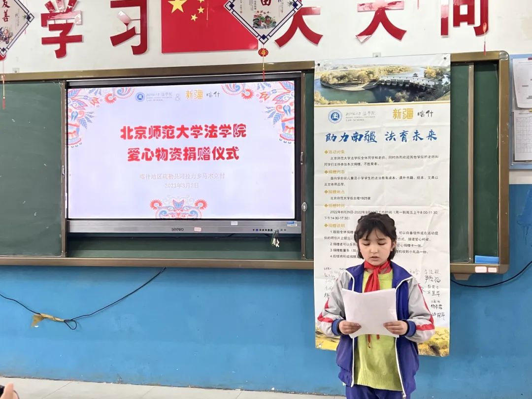 发起,为呼吁更多的老师和同学关注南疆教育事业,经前期线上推介会宣传、线下募集,学院师生纷纷响应,共捐赠法治教育读本、课外书籍、绘本、文具以及文体用品等千余件。这些爱心远渡千山万水来到马木克村小学的课堂上。虽然北京和喀什相距虽远,但马木克村的同学们已被北京的哥哥姐姐、老师们熟知,他们特地为每一位同学书写了寄语卡片,希望爱心和书香能够伴随每位同学们快乐成长。“马木克村的孩子们,希望你们好好学习,成长为栋梁之才!”“希望书本能够伴随你的童年,以后能有机会来北京玩。——北师大的一位姐姐。”……收到明信片的孩子们兴奋无比,二年级的小朋友阿卜杜热合曼·图尔迪说:“我要好好学习,以后也要去北京这个学校上学!”