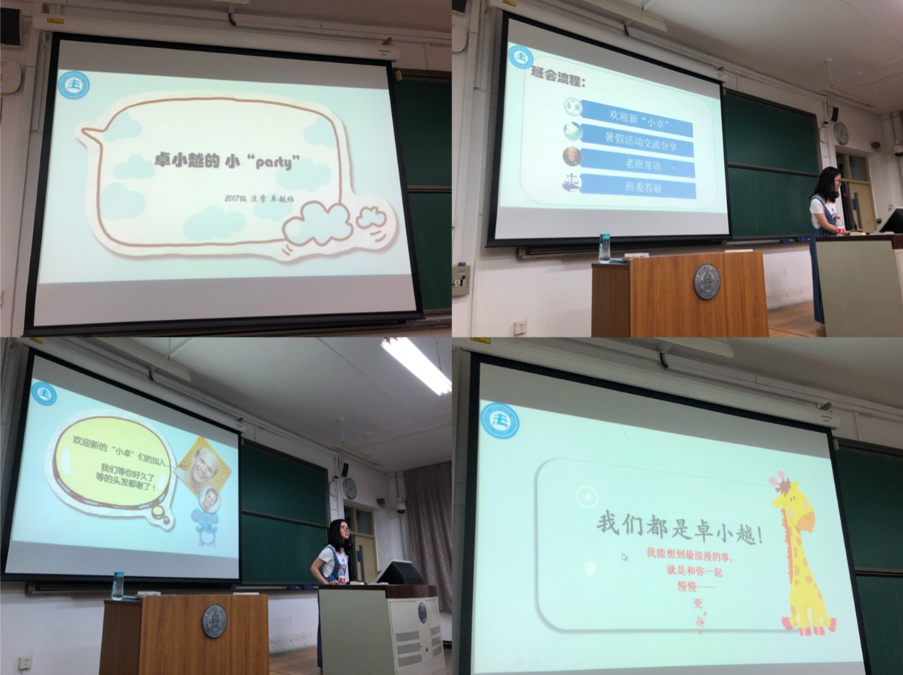 2018年9月15日晚,在班主任徐淑琳老师的支持下,2017级卓越实验班班委团组织了2018-2019学年的第一次班会。班会在教二201举行,由卓越班的两位班长王向荣和李超群同学主持,内容主要是介绍新同学,分享社会实践调研、支教和国际交流项目等内容丰富的暑期生活。