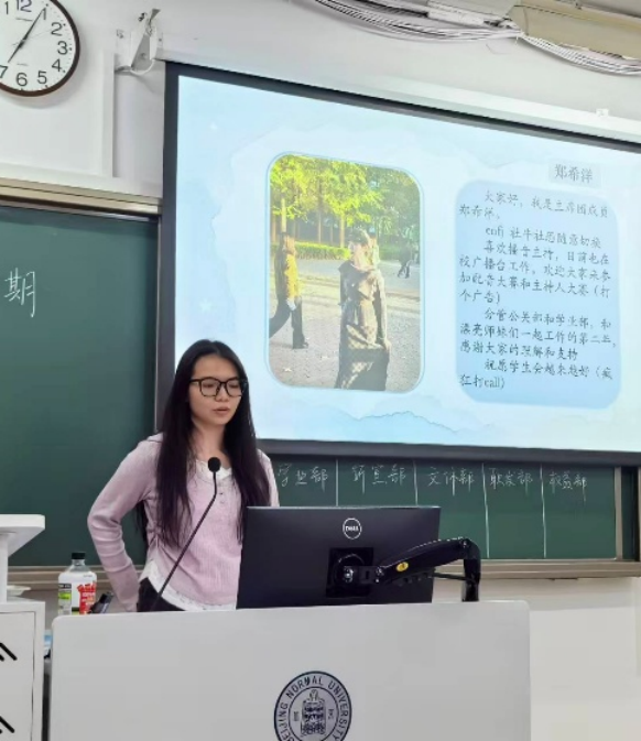 大会第三项——各部门介绍。公关部、学业部、新宣部、文体部、权益部和职业发展部的成员们在各部部长的带领下依次亮相,进行了精彩的自我介绍。同学们通过相同的爱好与经历结交新朋友,在学生会大家庭找到了强烈的归属感。