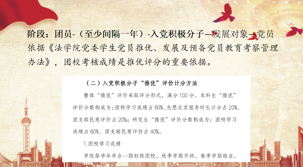 随后,主持人根据《日本AV 党委学生党员推优、发展及预备党员教育考察管理办法》为大家解读了推优评分构成、日本AV 初级团校模块设置以及团校考核方法,并在考核方法部分介绍了团校的考勤与请假方式,强调团校培养对于成员参与程度的要求,鼓励同学们多多参与、认真学习,在初级团校中收获时政知识、理论素养与友爱情谊。