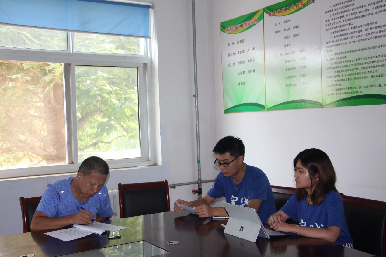 法制副校长组的同学也采访了门家庄中学的分管法治教育的副校长羡先生和王海小学的法制副校长王先生,两位校长热情地接受了我们的访谈。他们平易近人的言谈举止使负责采访的同学很快进入状态。