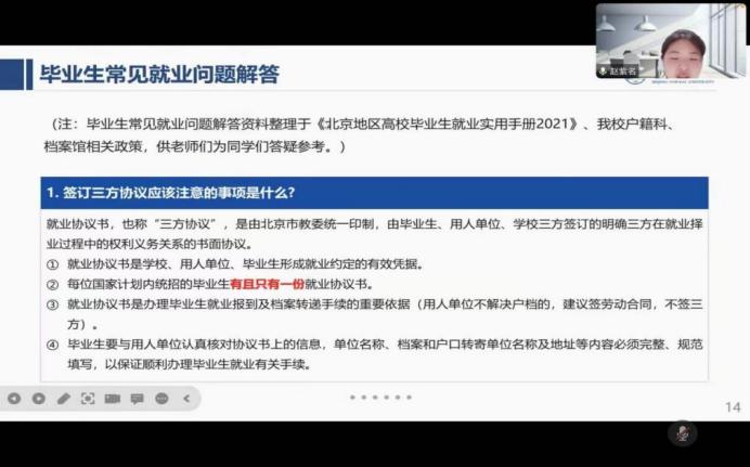 随后,赵老师又总结了同学们在填报系统时常出现的问题。比如,签订三方协议时的注意事项、签订就业协议书的权利义务和责任、户口和档案的迁转、户档能在学校保留的时长、毕业转档的主要类型、用人单位不接受户口时应如何办理就业手续等。