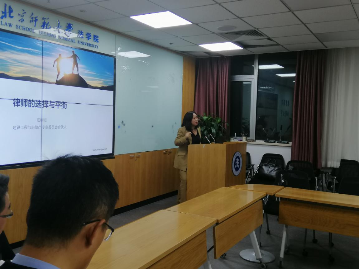 然后是范朝霞律师进行宣讲。范律师从职业流动情况出发为大家讲述了律师行业所具有的独特魅力。范律师结合自身经历以及多年事务经验指出,学习能力、理解能力、迅速抓住客户需求等能力是律师必备的能力。