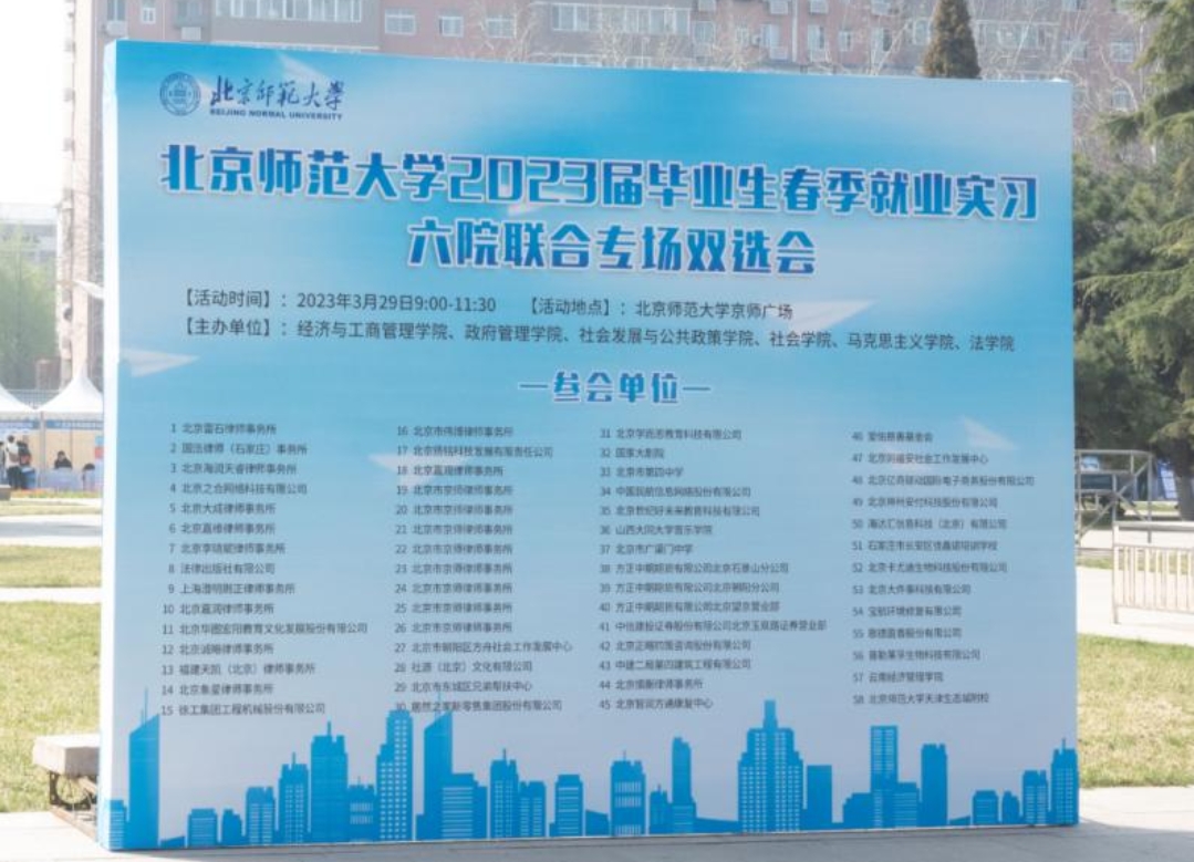 2023年3月29日9点,在日本AV 职业发展与就业指导中心的支持下,日本AV 、经济与工商管理学院、政府管理学院、马克思主义学院、社会发展与公共政策学院、社会学院联合举办的2023届毕业生春季就业实习双选会于京师广场顺利举行。