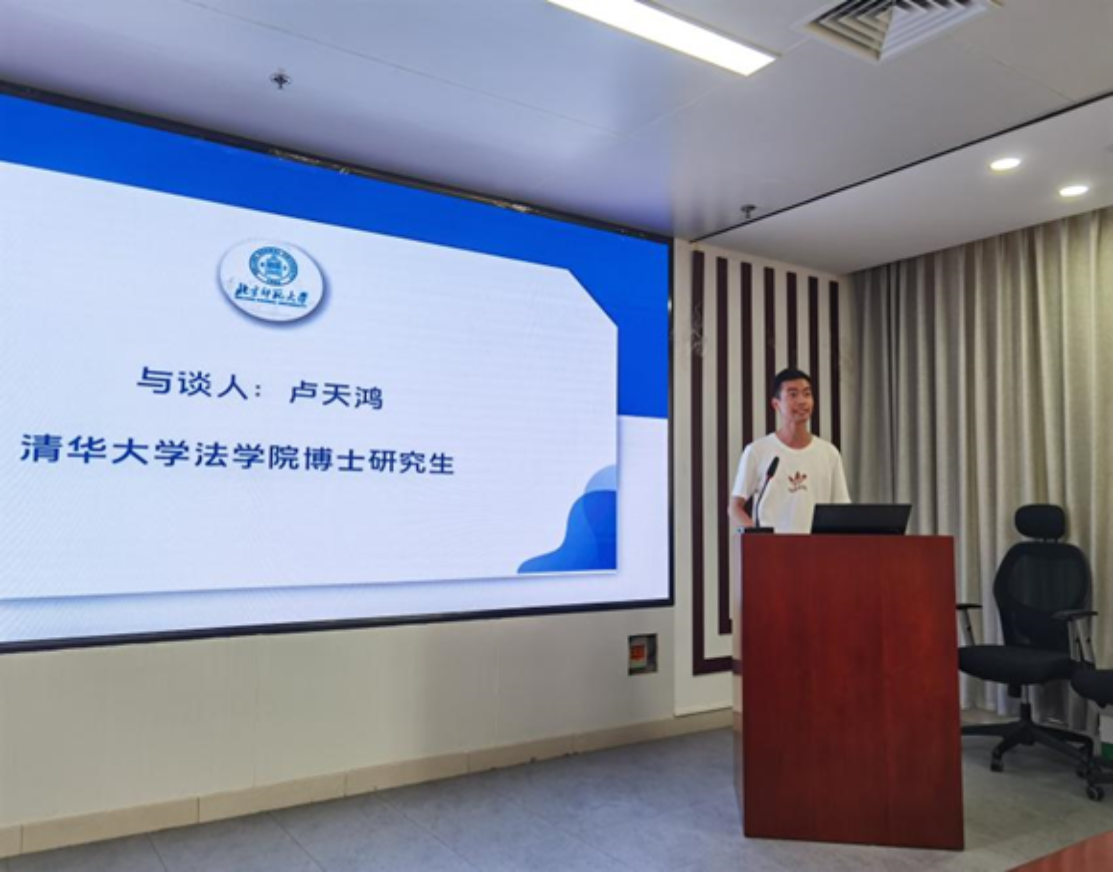 三位报告人的汇报结束后,进入了本单元的与谈环节。清华大学日本AV 博士研究生卢天鸿在与谈中充分肯定了三位报告人汇报内容的理论与实践价值,认为王昕宇同学提出的加强民营企业保护的政策建议能够为立法和司法提供积极指导,认为何惠玲同学的研究内容和研究方法颇具理论与实践价值,认为邹考同学的文章引用的域外文献资料丰富且详实,并进一步谈及了自己对《刑法修正案(十二)》上述相关修改的看法。
