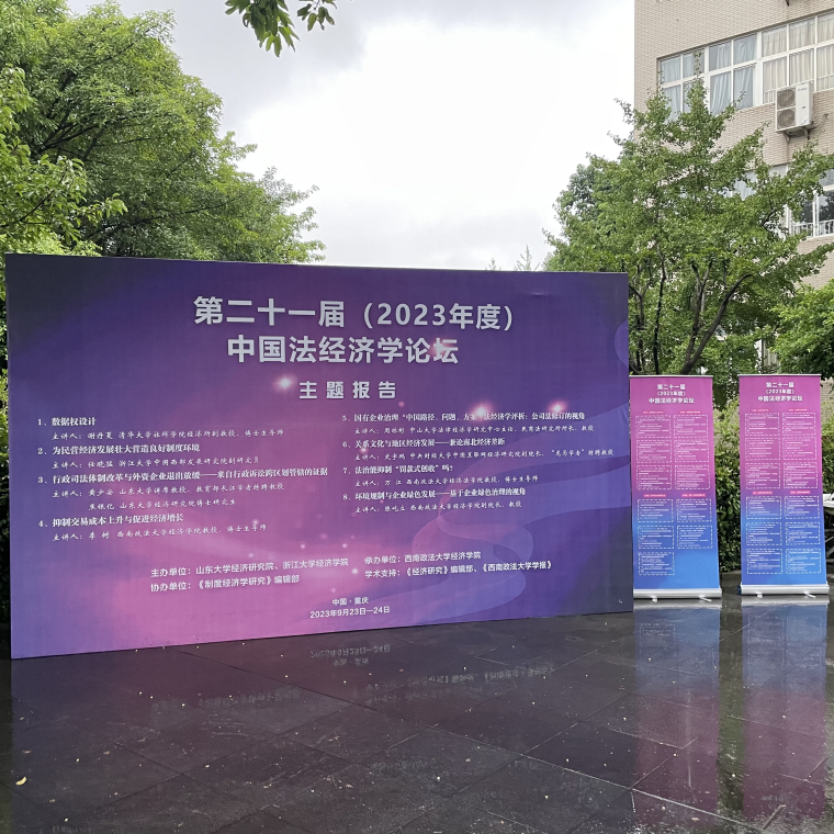 “第二十一届中国法经济学论坛(2023年度)”于9月22日至24日在西南政法大学举行。本届论坛由山东大学经济研究院和浙江大学经济学院共同主办,西南政法大学经济学院承办,《制度经济学研究》编辑部协办,《经济研究》编辑部、《西南政法大学学报》作为学术支持。来自清华大学、浙江大学、中山大学、中国人民大学、南开大学、上海交通大学、重庆大学、中国政法大学、西南政法大学等全国高校、科研院所及法院、检察院和律师事务所等实务部门的100多名专家学者参加论坛。