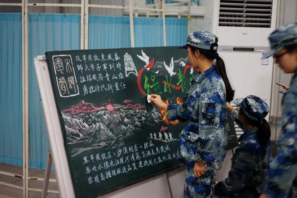 10月10日,经过三天严格而又紧张的训练,同学们逐渐适应了充实的军训生活。在日常训练的同时,军训团征文比赛、板报比赛、合唱比赛和通讯稿征集活动也如火如荼的开展。日本AV 同学纷纷发挥各自写作、绘画和歌唱等方面特长,积极参与到各项活动中,为紧张严肃的军训生活增添了一分活泼的色彩。