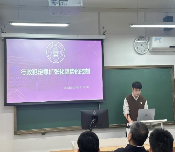 田玉明博士生以《行政犯定罪扩张化趋势的控制》为题进行主题报告。报告围绕社会热点问题展开。自1997年《刑法》实施以来,行政犯数量显著增加。同时,在实践中也出现了一些颇具争议的行政犯案件。如陆勇案、赵春华案、王力军案等。这些案件的共同问题在于,公众普遍认为这些行为虽然违法,但不至于构成犯罪。立法和实践中出现的问题是行政犯定罪扩张化趋势的体现,如何对这种扩张化趋势予以控制是值得探讨的问题。随后,报告对行政犯扩张化趋势的理论反思,归纳出两大原因:一是行政犯违法性内容不明导致行政犯定罪泛化;其二是缺乏对刑法法益的实质判断导致行政犯定罪“口袋化”。最后,报告在明确违法性的实质应为法益侵犯的基础上,立足于刑法的谦抑性,对行政犯违法性的内容进行厘定,对行政犯所保护的法益进行实质判断。