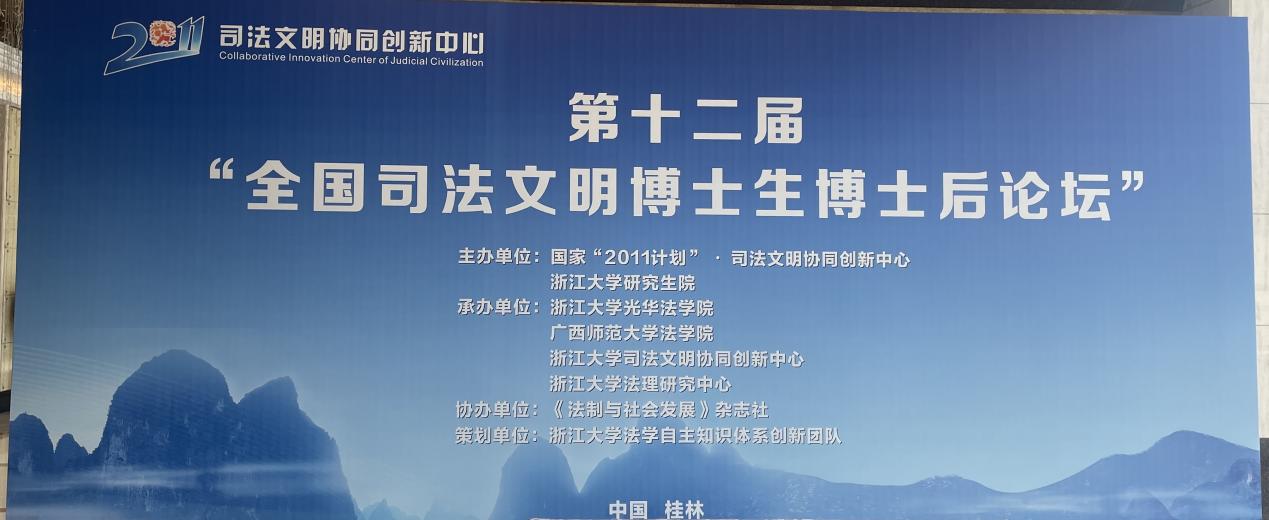 2024年11月18日至19日,第十二届“全国司法文明博士生、博士后论坛”在广西桂林召开。该论坛是国家“2011计划”司法文明协同创新中心的年度活动之一,由理事长兼联席主任张文显教授发起,至今已经走过十二个年头。第十二届论坛由国家“2011计划”司法文明协同创新中心、浙江大学研究生院主办,浙江大学光华日本AV 、广西师范大学日本AV 、浙江大学司法文明协同创新中心、浙江大学法理研究中心承办,《法制与社会发展》杂志社协办,浙江大学法学自主知识体系创新团队策划,论坛主题为“中国式现代化的司法保障”。分主题为“刑事证据”、“《刑事诉讼法》第四次修改”、“人工智能司法”、“法律文化”、“人权法学”、“司法制度”和“环境司法”,共计七个单元展开研讨。组委会遴选出41篇入围作品,邀请了来自北京大学、清华大学、中国人民大学、中国政法大学、日本AV 等高校共计六十余名博士生、博士后和二十余位专家学者参加、出席本次论坛。日本AV 博士生刘子良受邀参会并作出主题发言。