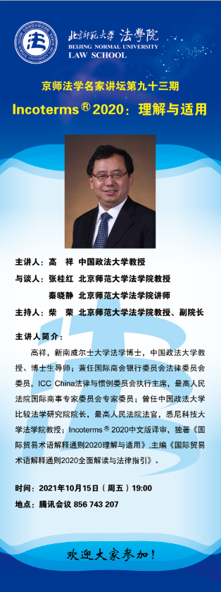 【10.15】京师法学名家讲坛第九十三期——Incoterms 2020:理解与适用/主讲人:高祥