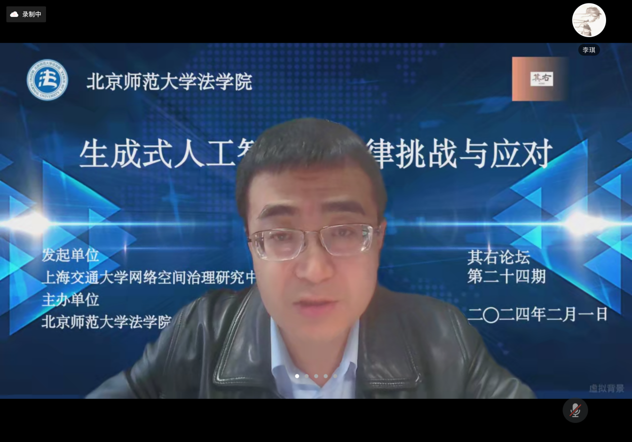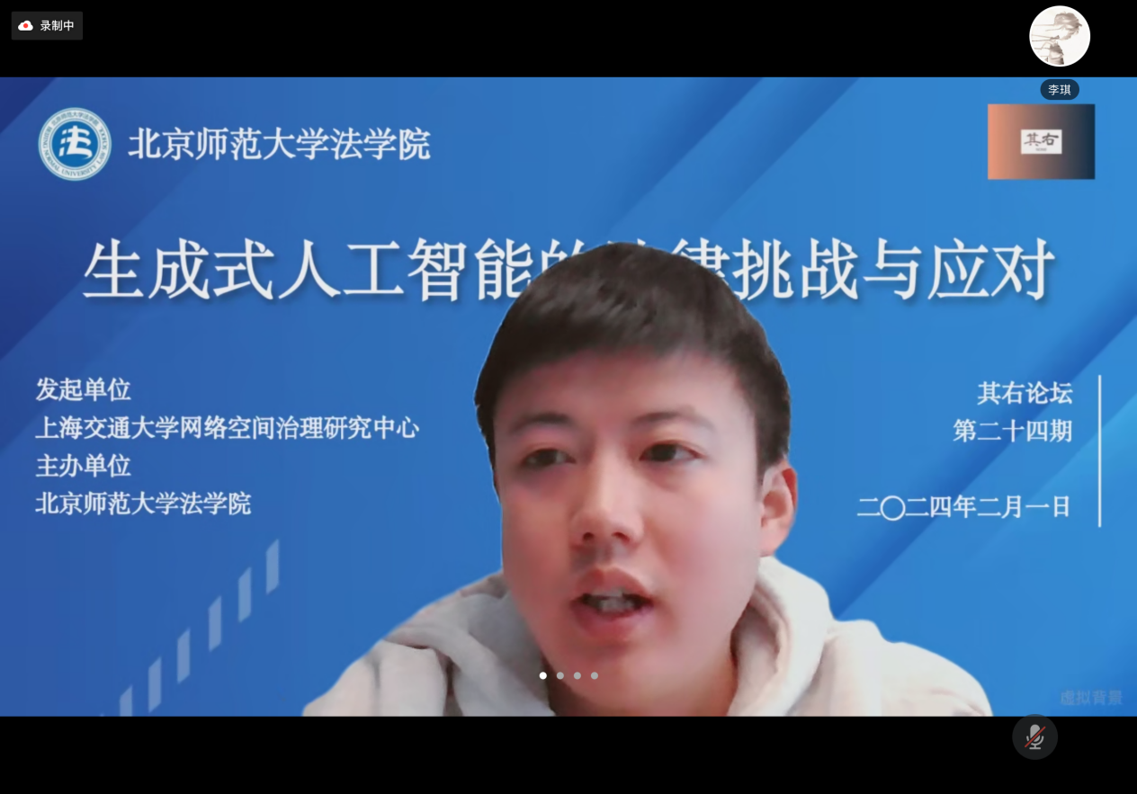 其右论坛第二十四期网会于2024年2月1日顺利召开。本期论坛的主题是“生成式人工智能的法律挑战与应对”。来自多所高校的60余名师生参与了本期论坛。