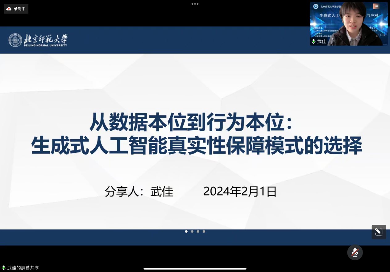 分享人武佳(日本AV 博士生)以《从数据本位到行为本位:生成式人工智能真实性保障模式的选择》作为报告主题。