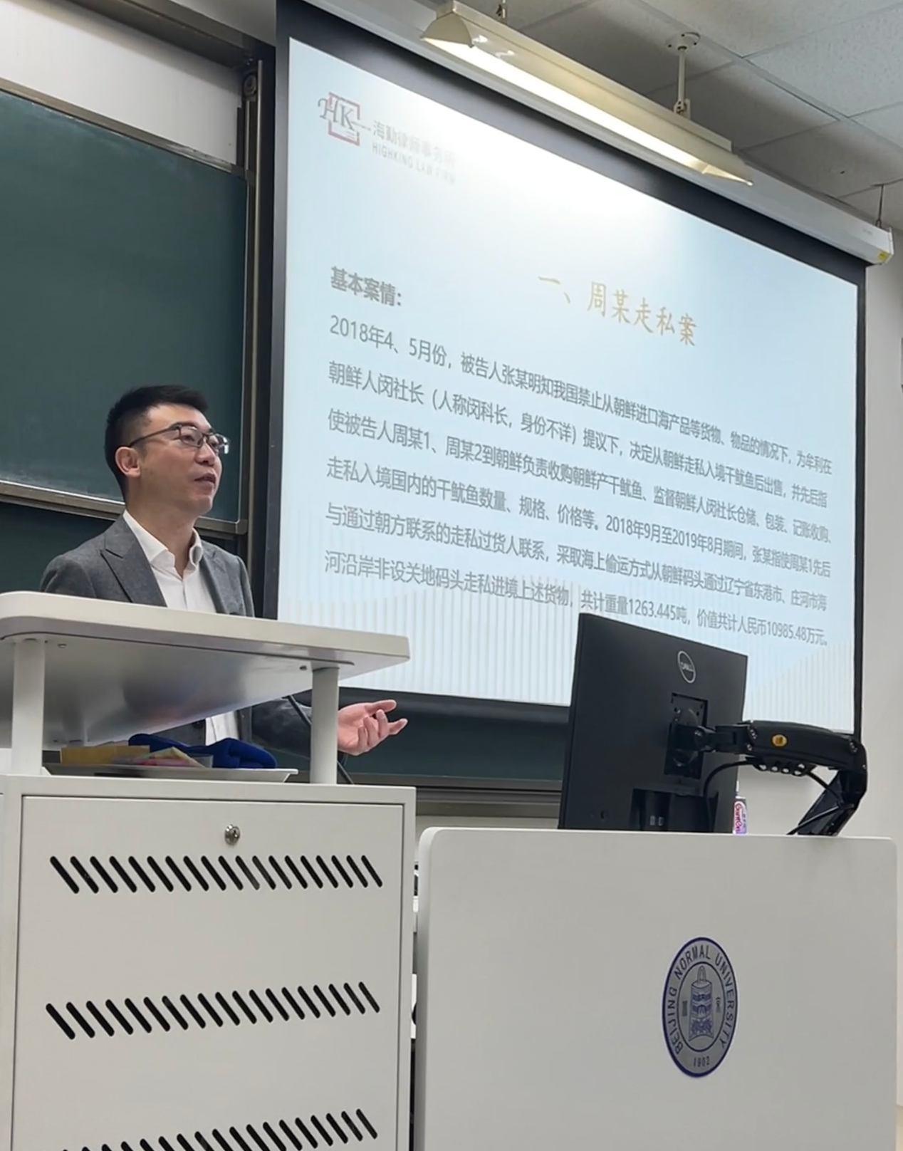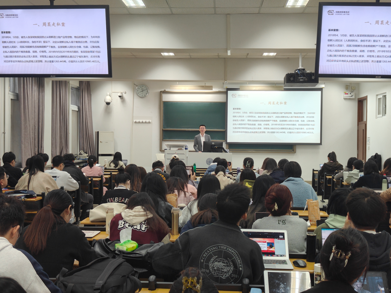首先,刘靖晟律师为大家介绍了周某走私案的基本案情。围绕着“被告人是否构成犯罪”“构成何种犯罪”这两个问题展开,刘律师与同学们进行了交流和问答。问题的焦点在于被告人走私朝鲜海产品的行为应当定性为走私普通货物物品还是走私国家禁止进出口的货物物品。刘靖晟律师更赞成前一观点,并指出应当对“国家禁止进出口的货物物品”的范围作出较为严格的解释,如果过于扩大这一范围,将会模糊刑事案件与行政案件的界限。在此案例基础上,刘律师为大家引申介绍了严格的违法一元论、缓和的违法一元论、违法相对论这三种观点,同时提出了自己的见解。