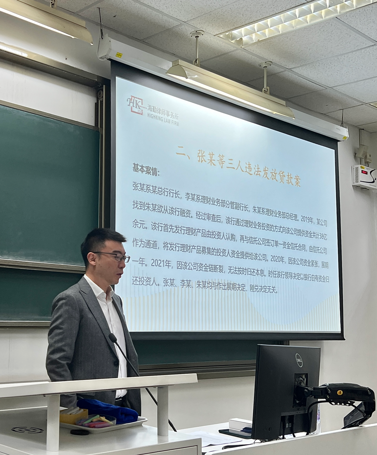 接着,刘靖晟律师与同学们探讨了张某等三人违法发放贷款案,并对有关法律规定的演变提出了自己的看法。随着刑法修正案的颁布,违法发放贷款罪将贷款数额作为入罪条件来考虑,一方面这一做法有利于追诉犯罪,但另一方面将其作为入罪条件而将损失数额作为量刑情节来考量的做法在一定程度上缺少合理性。针对张某等三人是否构成犯罪,刘律师指出,行为当时没有法律规定通道业务是违法的,在没有规避监管的情况下不能任意将通道业务穿透理解为贷款业务,且本案中银行并未实际遭受损失,银行的资金安全,也就是本罪的客体之一并未受到侵犯,不能仅因贷款数额符合构罪要求就认定犯罪。此外,刘律师为同学们拓展介绍了银信通道业务与自营贷款的区别。