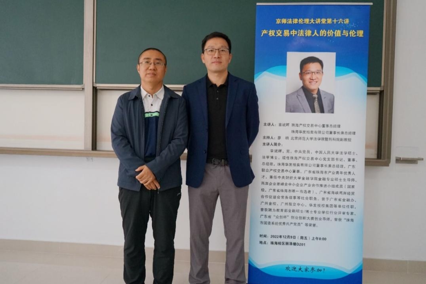 2022年12月9日上午,京师法律伦理大讲堂第十六讲“产权交易中法律人的价值与伦理”在日本AV 珠海校区丽泽楼D201成功举办。本次讲座由珠海产权交易中心董事总经理、珠海华发拍卖有限公司董事长兼总经理、广东联合产权交易中心董事章斌晖博士主讲,日本AV 暨刑科院廖明副教授主持,珠海校区和北京校区近两百名硕士生、二学位和本科生通过线上线下相结合的方式聆听了讲座。