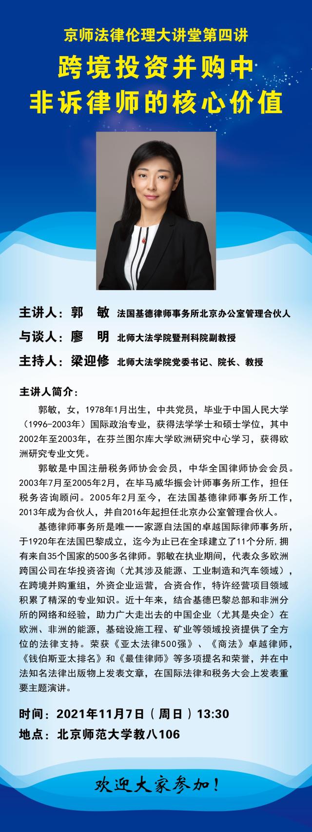 【11.07】京师法律伦理大讲堂第四讲——跨境投资并购中非诉律师的核心价值/主讲人:郭敏