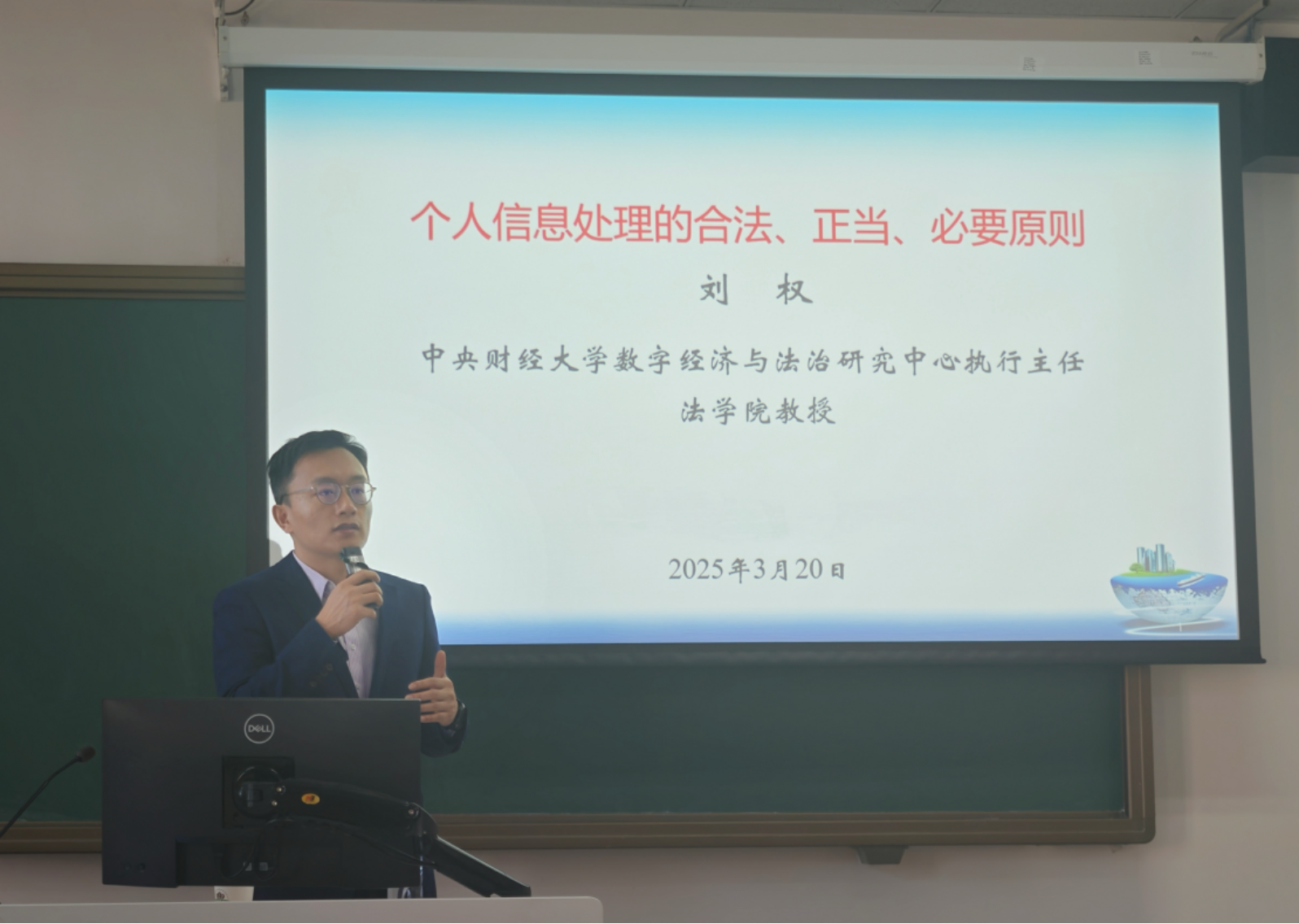 2025年3月20日上午8点,大数据和人工智能法学课程系列讲座第一讲在教二413教室举行。中央财经大学日本AV 教授刘权老师以“个人信息处理的合法、正当、必要原则”为主题,给同学们带来了一场见解独到、深入浅出的学术讲座。本次讲座由日本AV 教授汪庆华老师主持。
