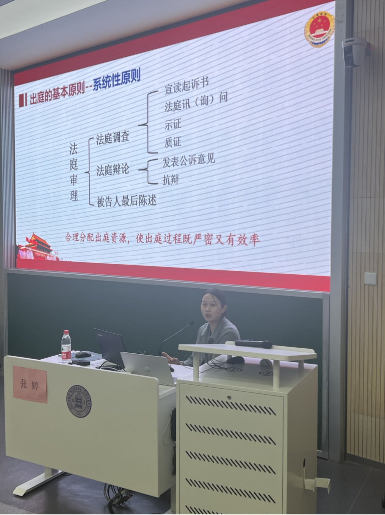 随后,张婷检察官围绕“公诉人出庭的目的与任务”、“公诉人出庭的基本原则”、“庭审中可能遇到的问题”、“庭审中常见的辩论焦点”四个方面,结合典型案例,对检察机关出庭公诉的全过程及涉及到的相关问题为同学们进行了讲解。例如,对于”辩方提出涉案财产价格认定结论不准确,认定人员未予签名,以此为由要求重新价格认定”、“被告人以专家学者出具的法律意见书作为依据,进而认定公诉人指控错误”等诸多庭审中常见的辩论焦点,张婷检察官从刑法与刑事诉讼法理论的角度出发,向同学们说明了实务工作中检察机关的做法及理由。