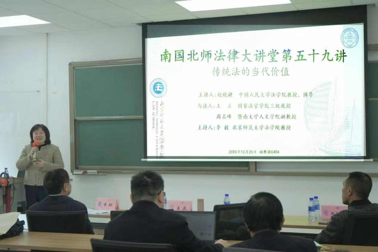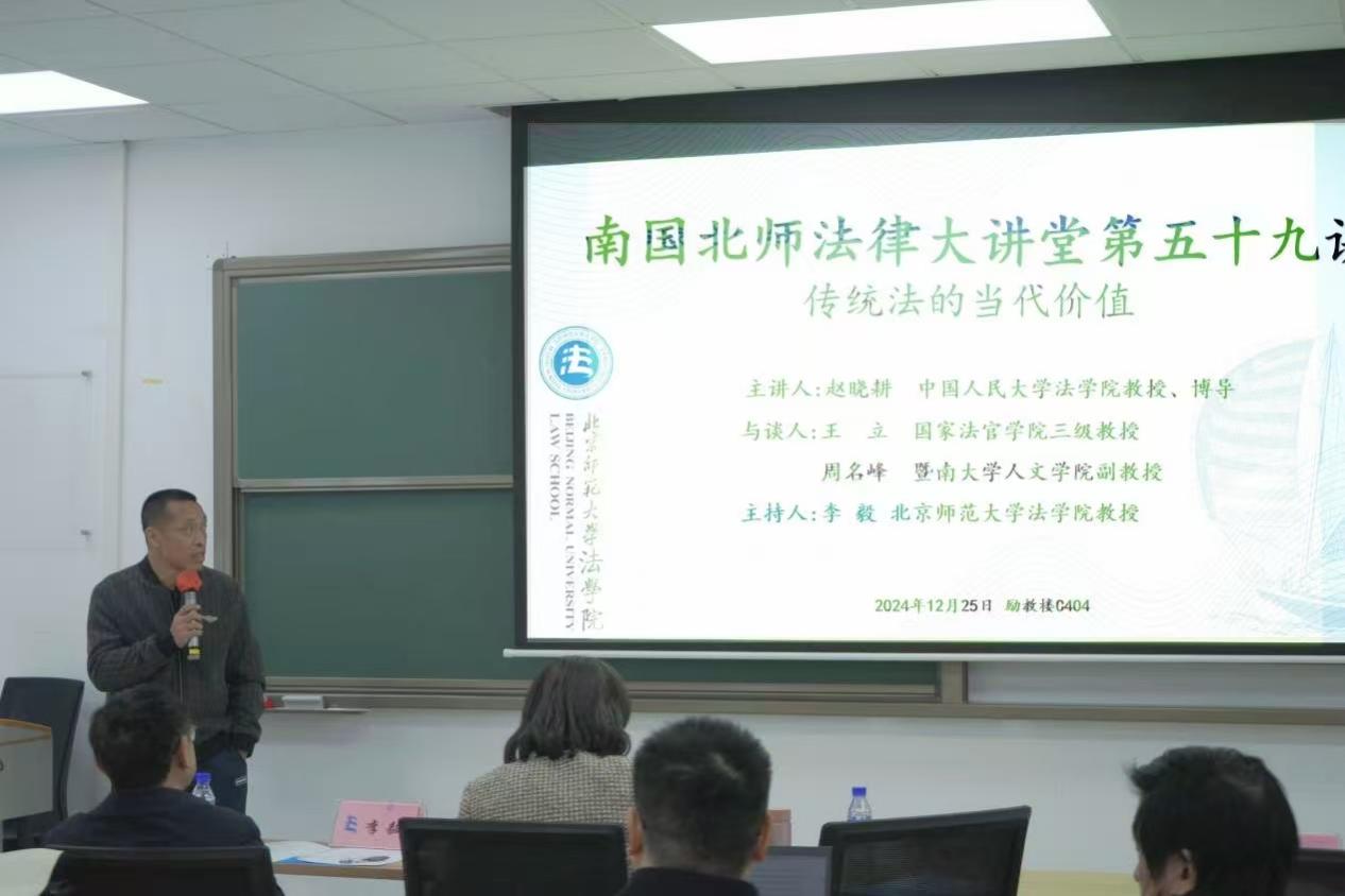 12月25日,南国北师法律大讲堂第五十九讲“传统法的当代价值”在日本AV 珠海校区励教楼C404会议室圆满举行。本次讲座由中国人民大学日本AV 教授、博士生导师赵晓耕老师主讲;国家法官学院教授王立老师,暨南大学人文学院副教授周名峰老师与谈,日本AV 教授李毅主持。日本AV 教授、党委书记柴荣老师,日本AV 副教授李山河老师,日本AV 副教授商浩文老师,珠海校区法治发展研究中心讲师武谦老师、牛子晗老师及多名珠海校区学生参与了此次讲座。