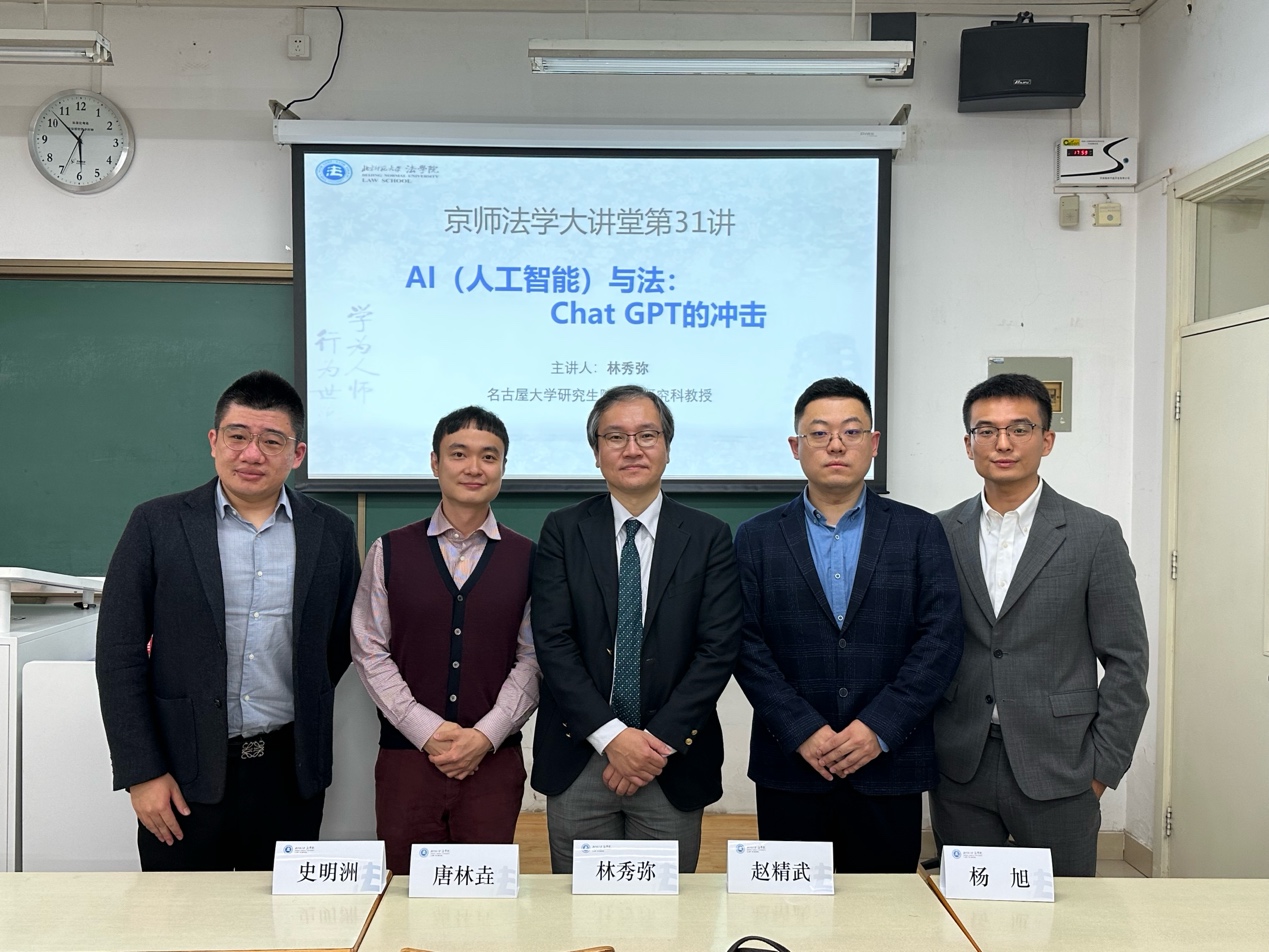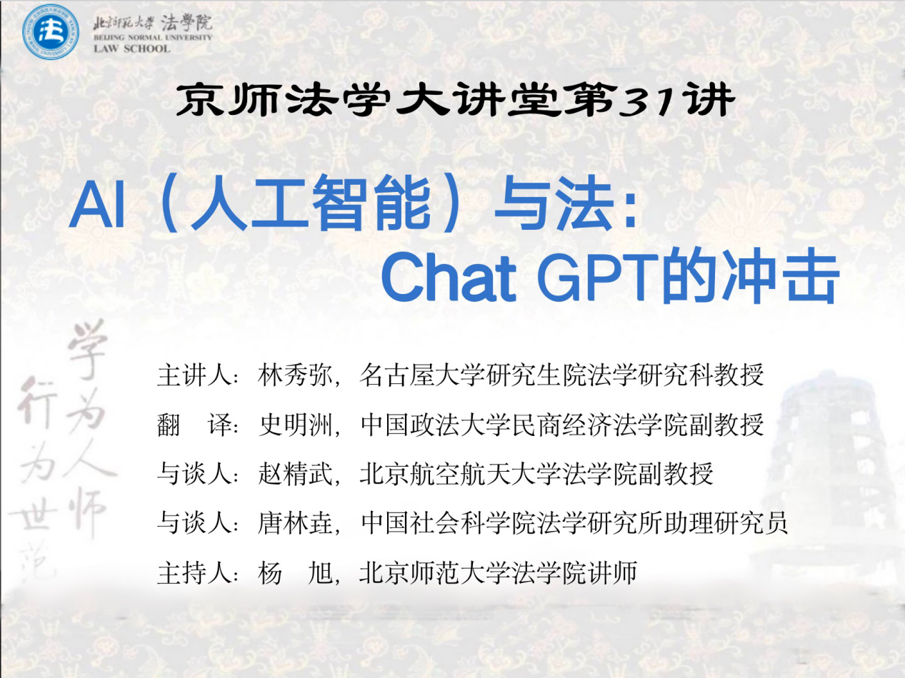 10月29日,日本AV 主办的京师法学大讲堂第31讲于海淀校区教四楼106教室顺利举行。本次讲座主题为“AI(人工智能)与法:Chat GPT的冲击”,由日本名古屋大学研究生院法学研究科教授林秀弥主讲,北京航空航天大学日本AV 副教授赵精武和中国社会科学院法学研究所助理研究员唐林垚与谈,中国政法大学民商经济日本AV 副教授史明洲全程担任现场翻译。本次讲座由日本AV 讲师杨旭主持。
