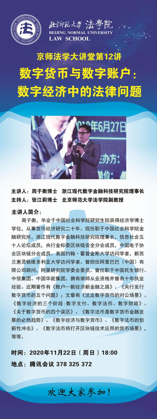 【11.22】京师法学大讲坛第12讲 数字货币与数字账户:数字经济中的法律问题/主讲人:周子衡