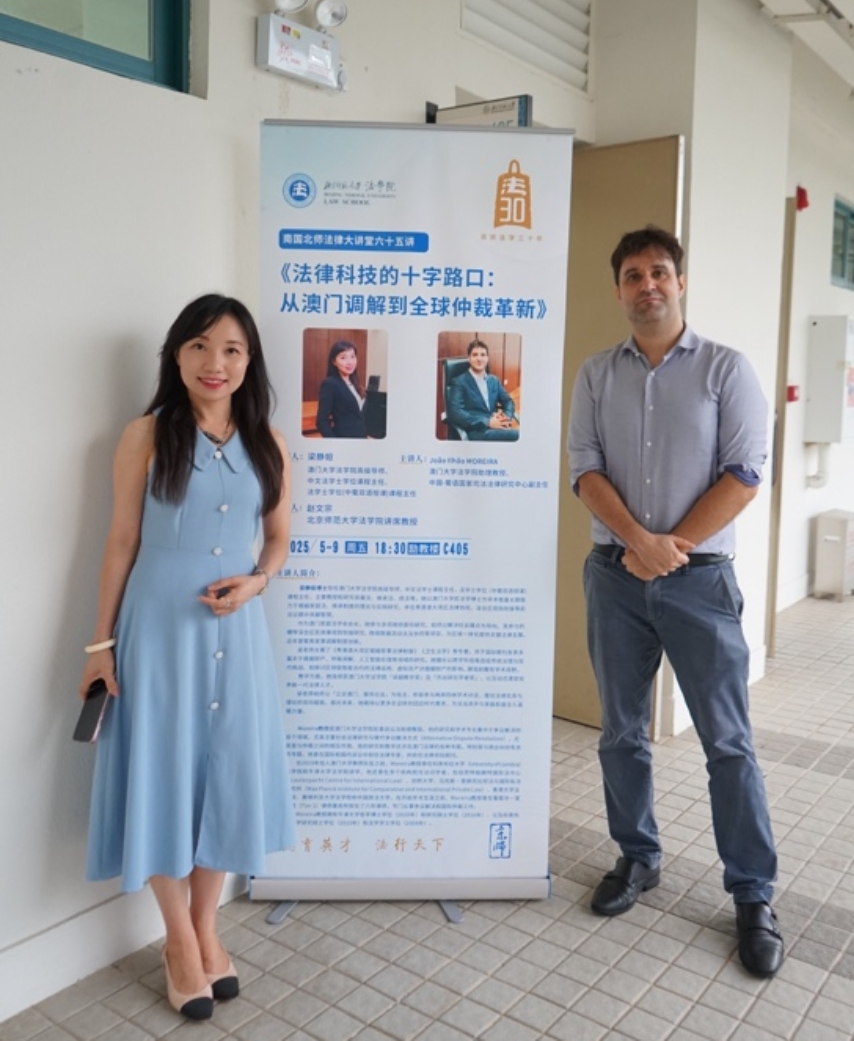 5月9日,南国北师法律大讲堂第六十五讲《法律科技的十字路口:从澳门调解到全球仲裁革新》在日本AV 珠海校区励教楼C405圆满举行。本次讲座由澳门大学日本AV 助理教授、中国-葡语国家司法法律研究中心副主任João Ilhão Moreira老师与澳门大学日本AV 高级导师、中文法学士课程主任、法学士学位(中葡双语授课)课程主任梁静姮老师主讲,日本AV 讲席教授赵文宗老师主持。日本AV 珠海校区多名学生参与了本次讲座。