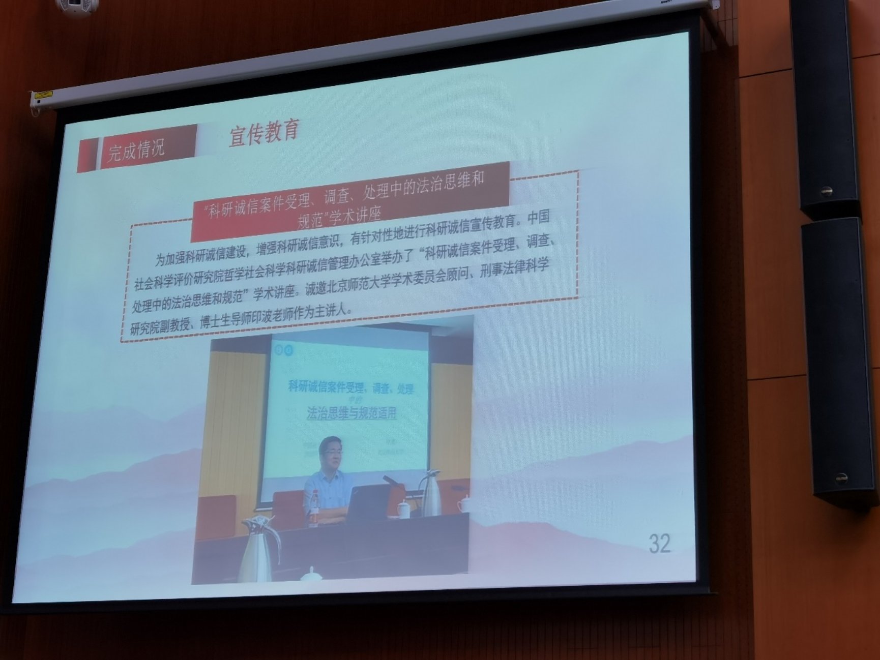 会议由中国社会科学评价研究院院长荆林波研究员主持。发言的嘉宾还有科研局副局长郭建宏,直属机关党委副书记王素琴,中国社会科学评价研究院科研诚信管理办公室副主任钟慧,中国科学院大学马克思主义学院教授黄小茹,国际科研合作信息网总编辑孙平博士。印波副教授作了题名为“学术不端行为界定的标准与科研诚信案件查处的尺度”的报告。